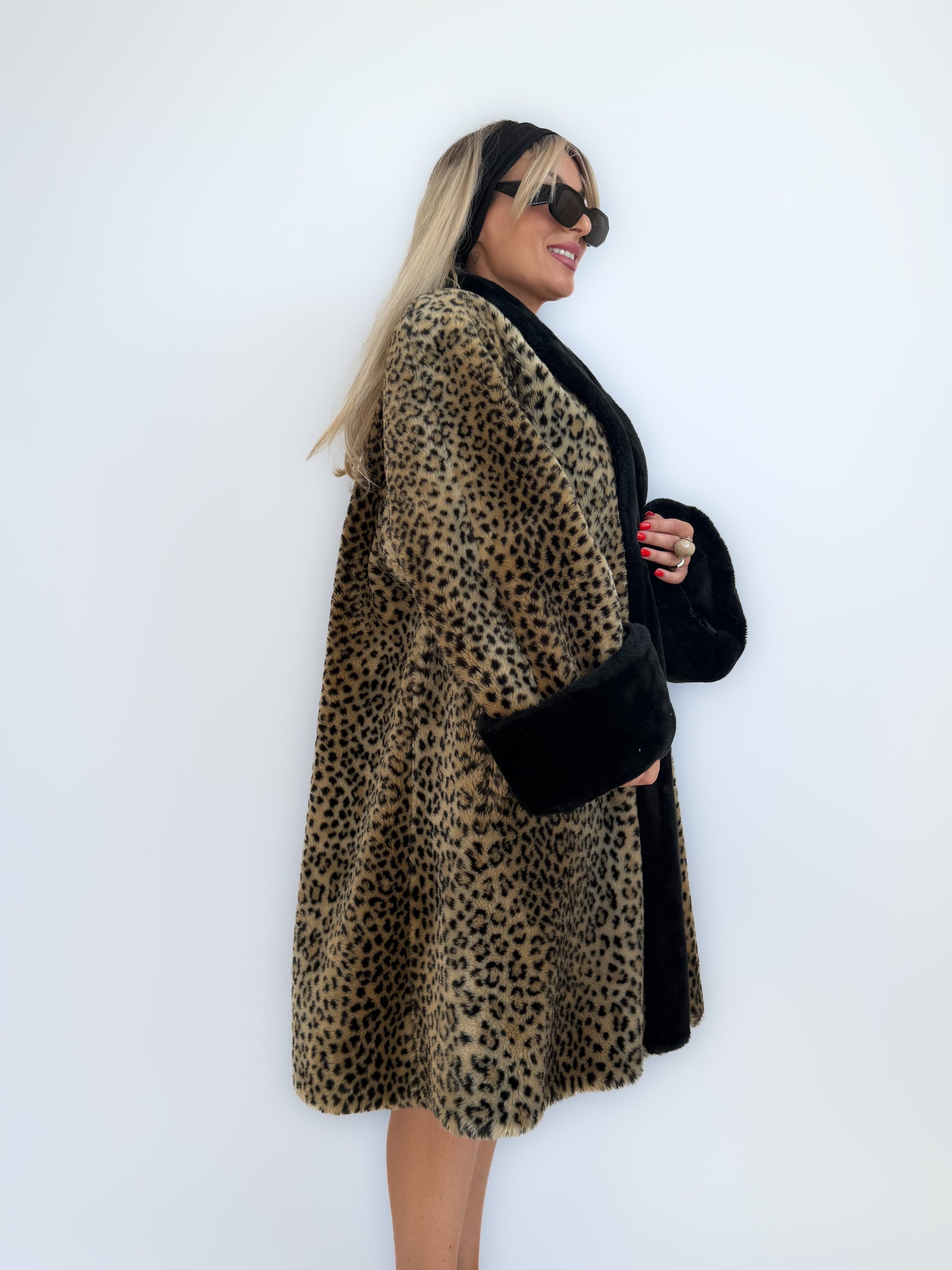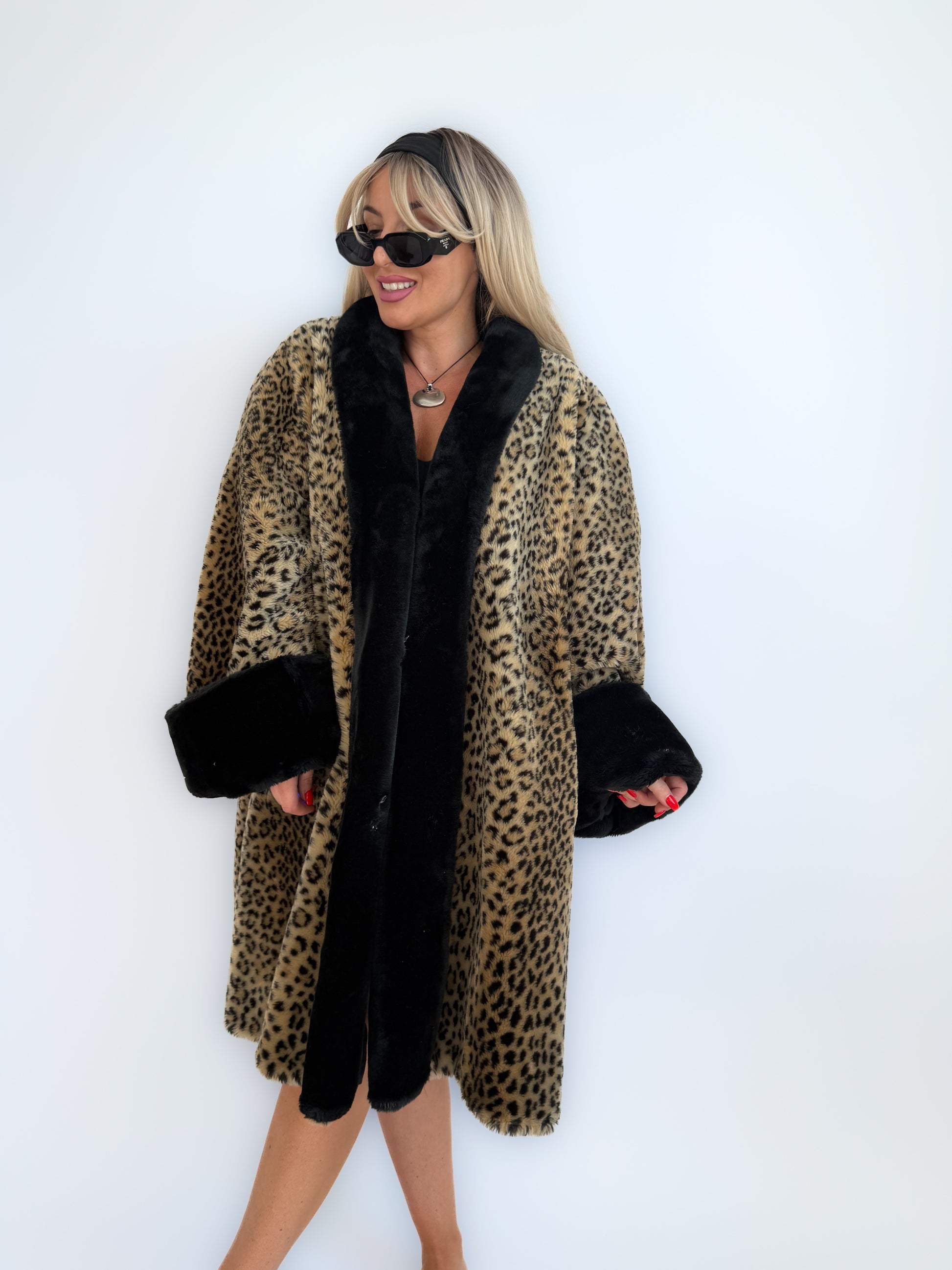 Unleash your wild side in this vintage cheetah print faux fur coat, finished with plush black trim for that iconic mob wife glam. With an oversized A-line cut, structured shoulders, and cozy side pockets, this coat makes an unforgettable statement—whether you’re layering it over a little black dress or styling it for streetwear chic.