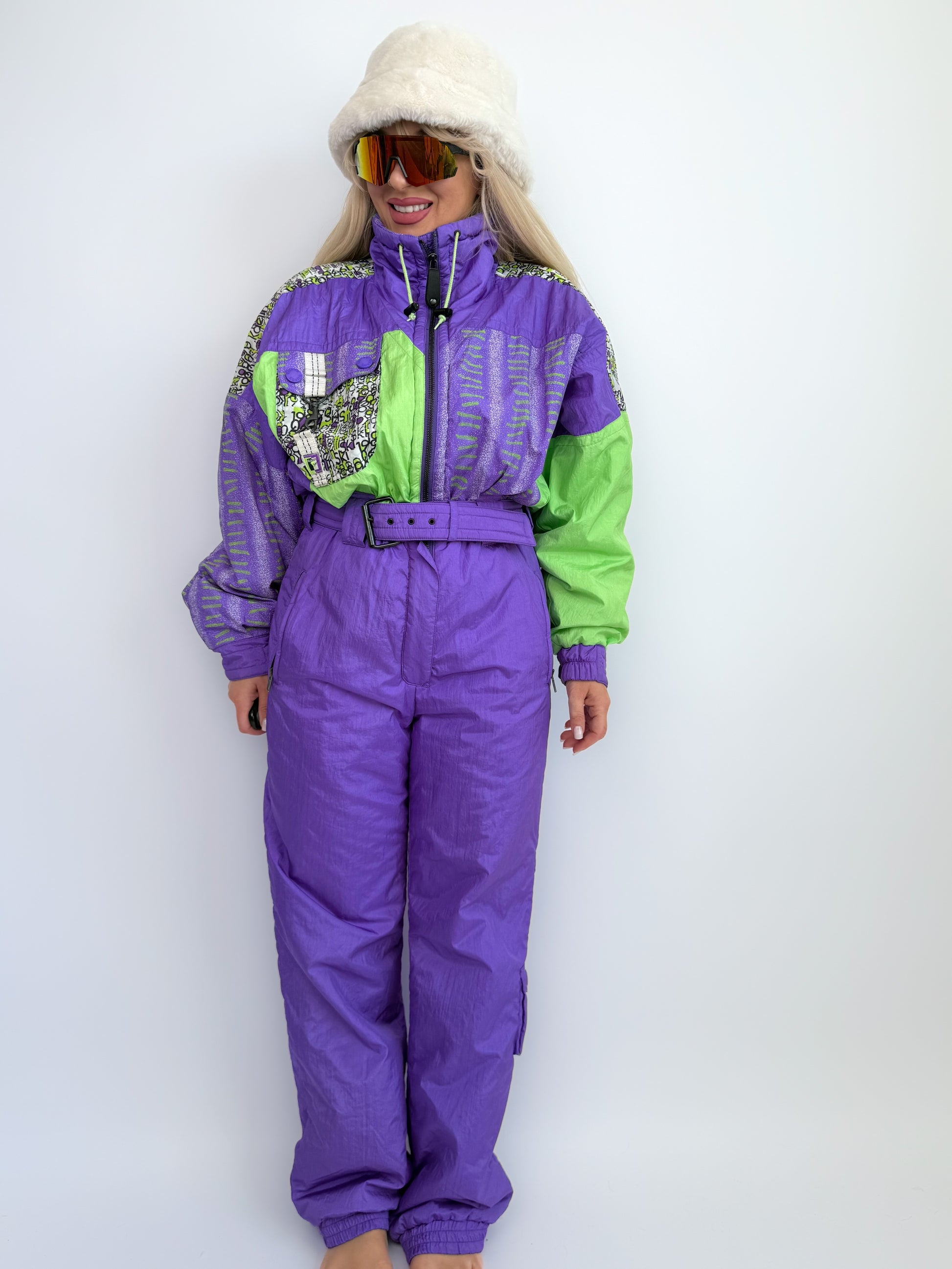 This vintage 90s ski suit is pure retro neon glam — purple and green with bold abstract print. Designed for the slopes but perfect for festival fashion too, it features a belted waist, padded warmth, and a one-piece silhouette that screams slope bunny energy.