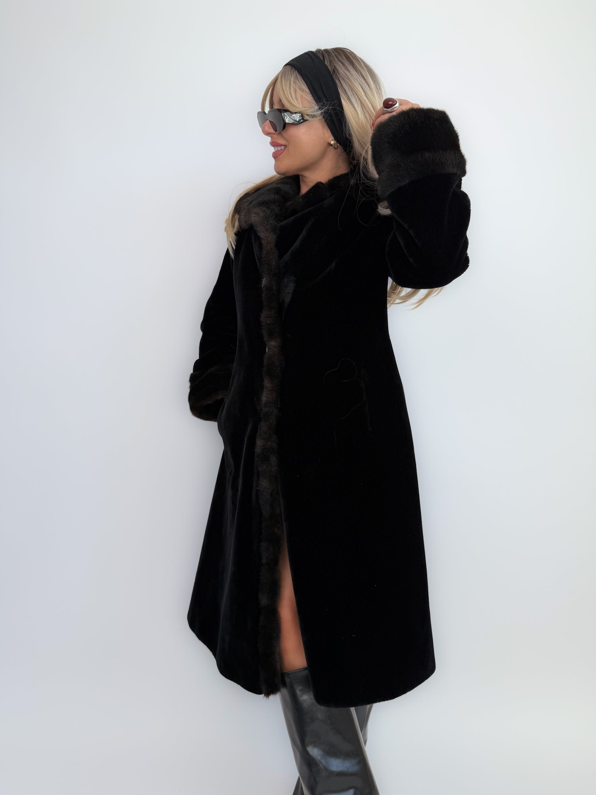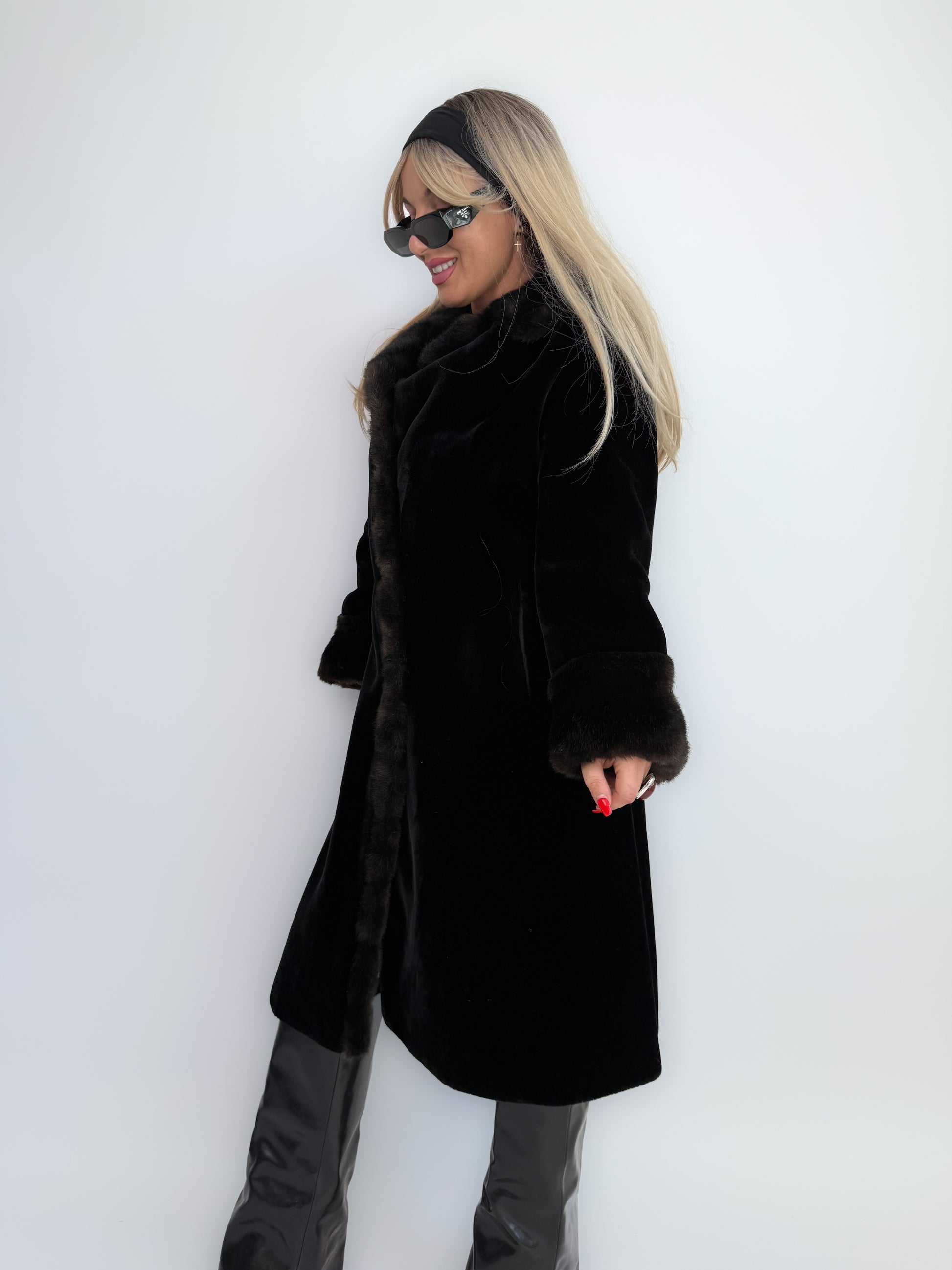 A statement in elegance, this 1960s Borgazia faux fur coat is all about luxe texture and timeless style. The soft black velvet body contrasts beautifully with the plush faux fur collar and cuffs, creating a look that feels both glamorous and iconic. Perfect for cocktail evenings, winter weddings, or simply stepping out in sophisticated mob-wife energy. Jackie O vibes.