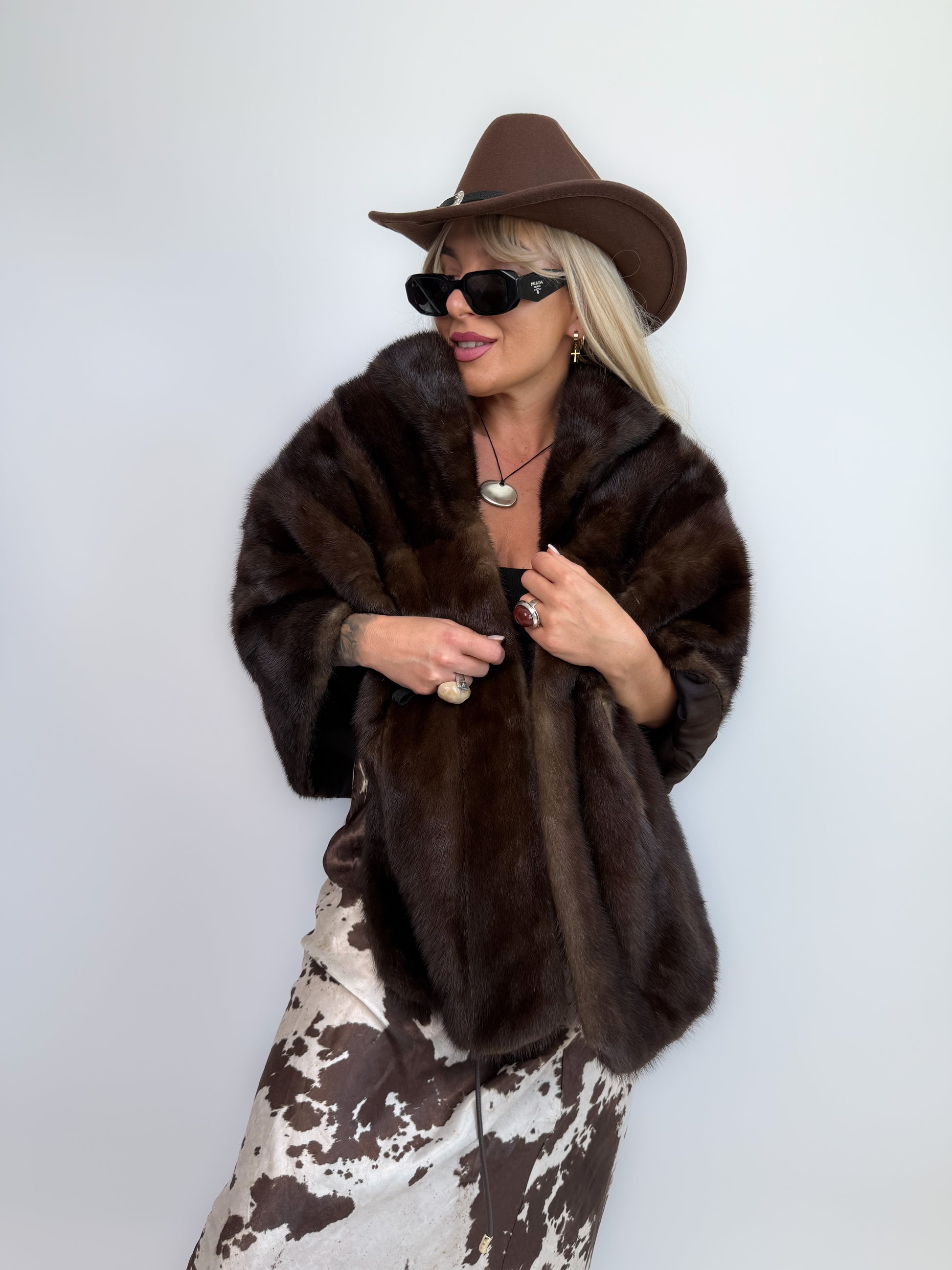 An iconic 1980s mink fur poncho wrap in deep chocolate brown — the ultimate luxe statement for winter evenings, formal occasions, or mob-wife-inspired street style.