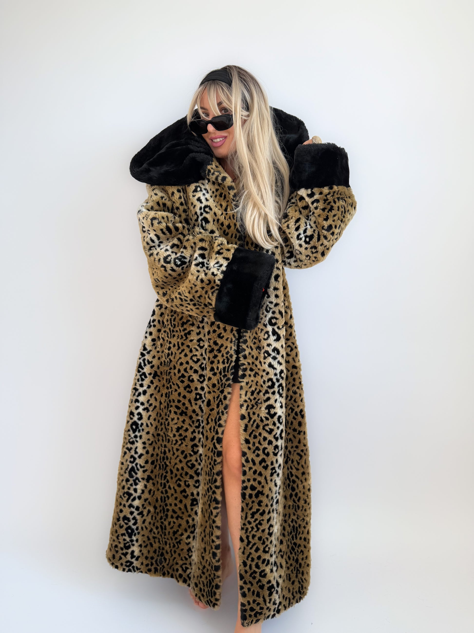 Vintage 90s Leopard Print Faux Fur Maxi Long Coat – Oversized Hooded Mob Wife Statement Jacket L-XL