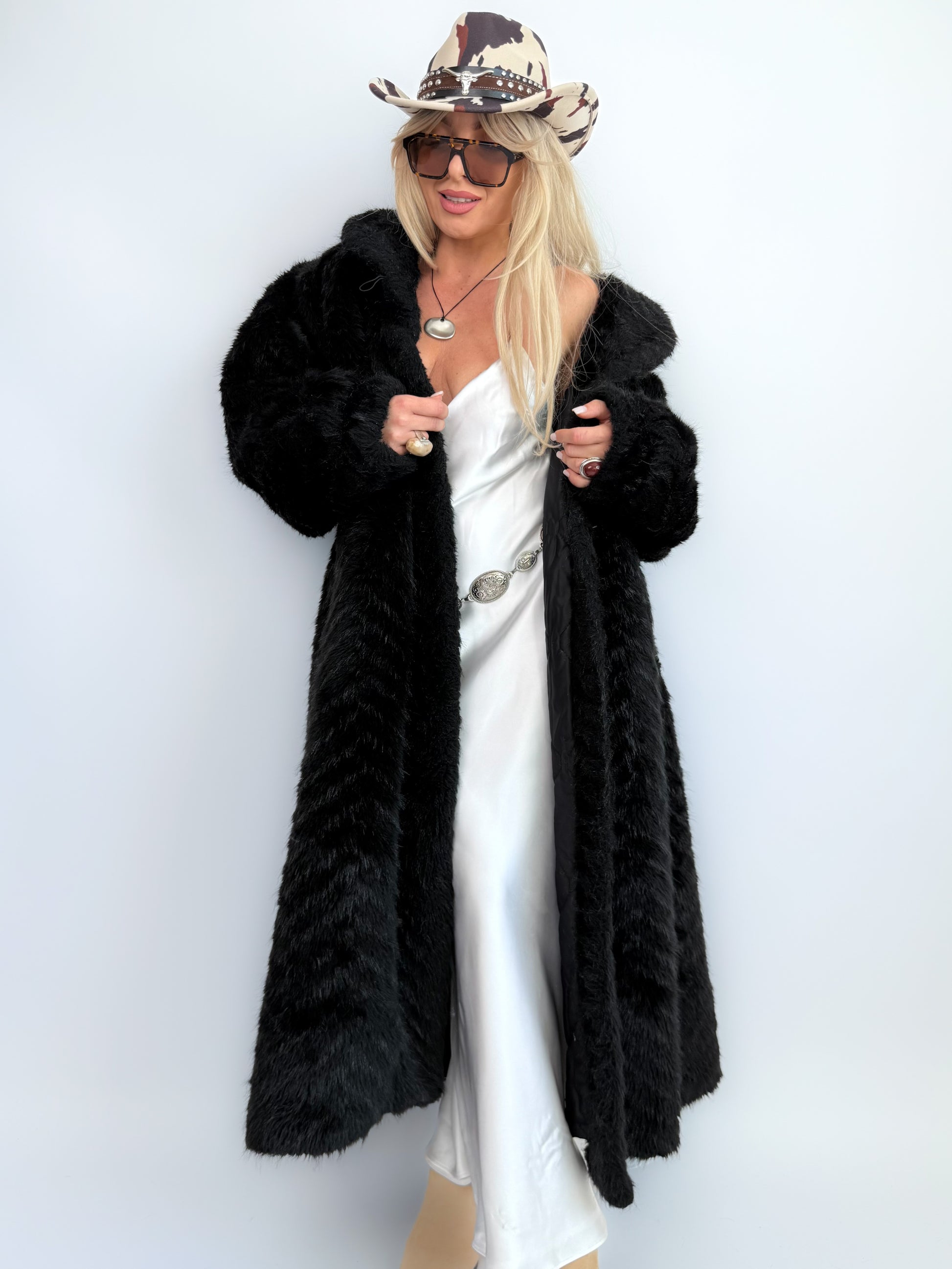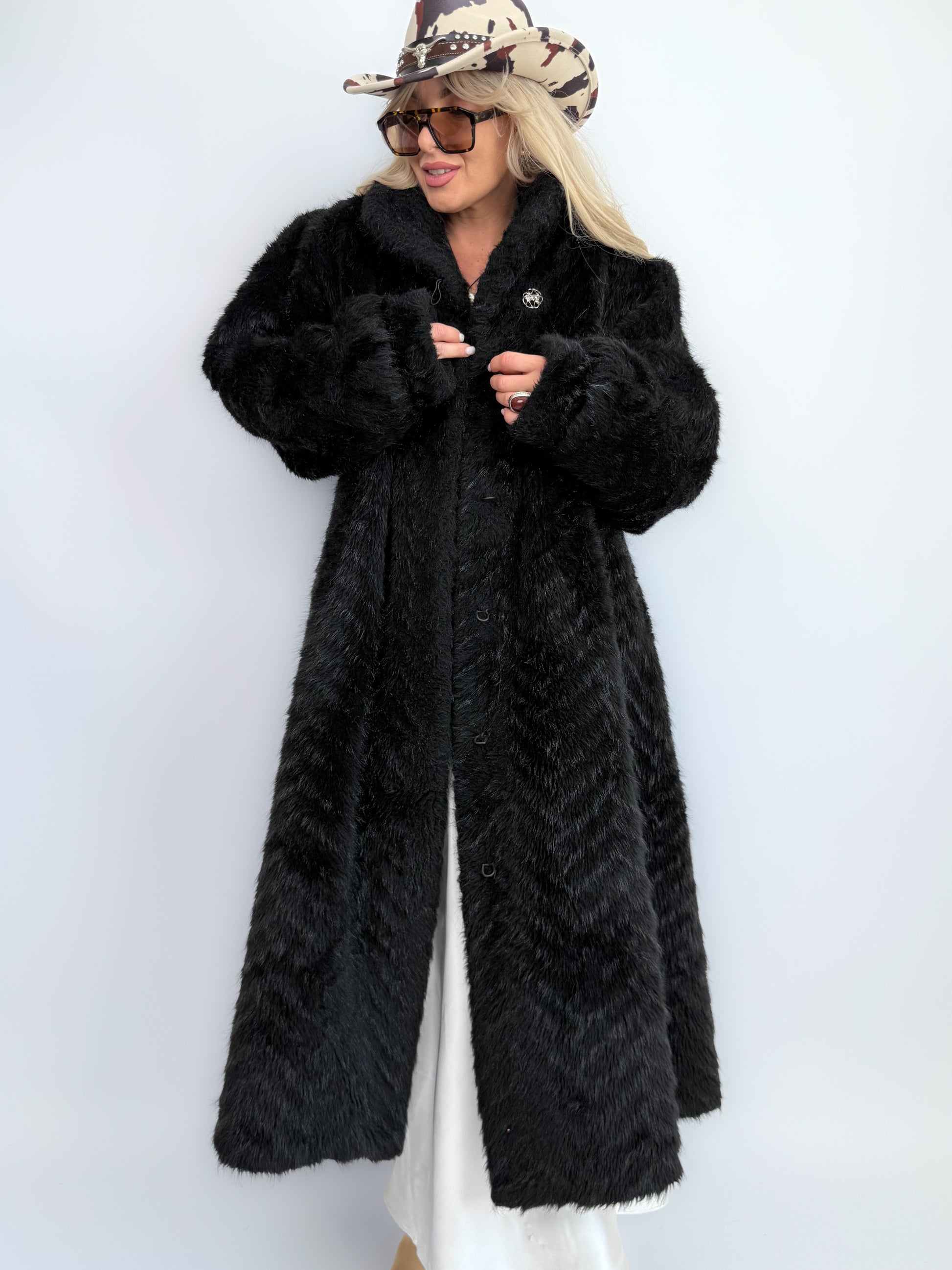 Vintage Faux Fur- Long Winter Coat in Black- L XL