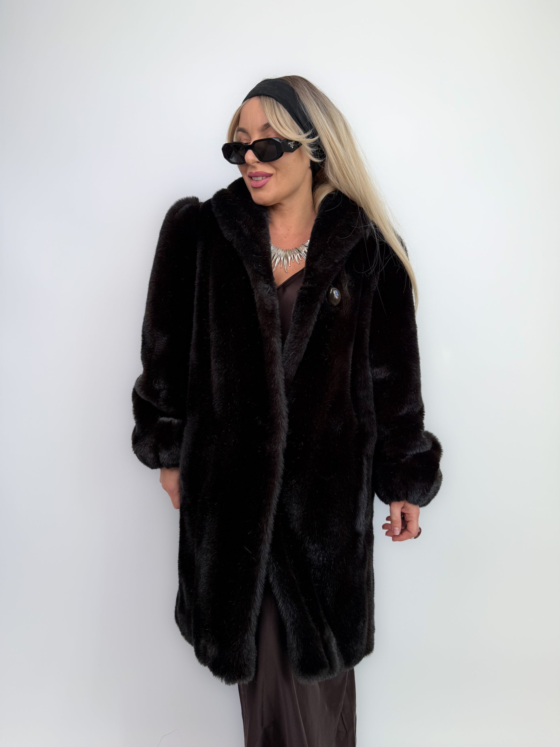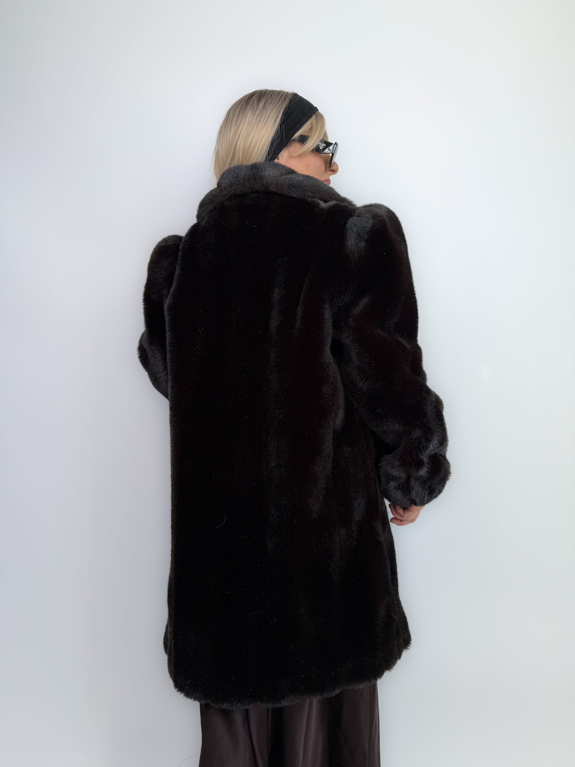 Channel timeless sophistication with this vintage dark brown faux fur coat — made in the USA and lined for comfort and warmth. Its soft sheen and minimalist silhouette exude quiet luxury, perfect for both day and night winter looks.