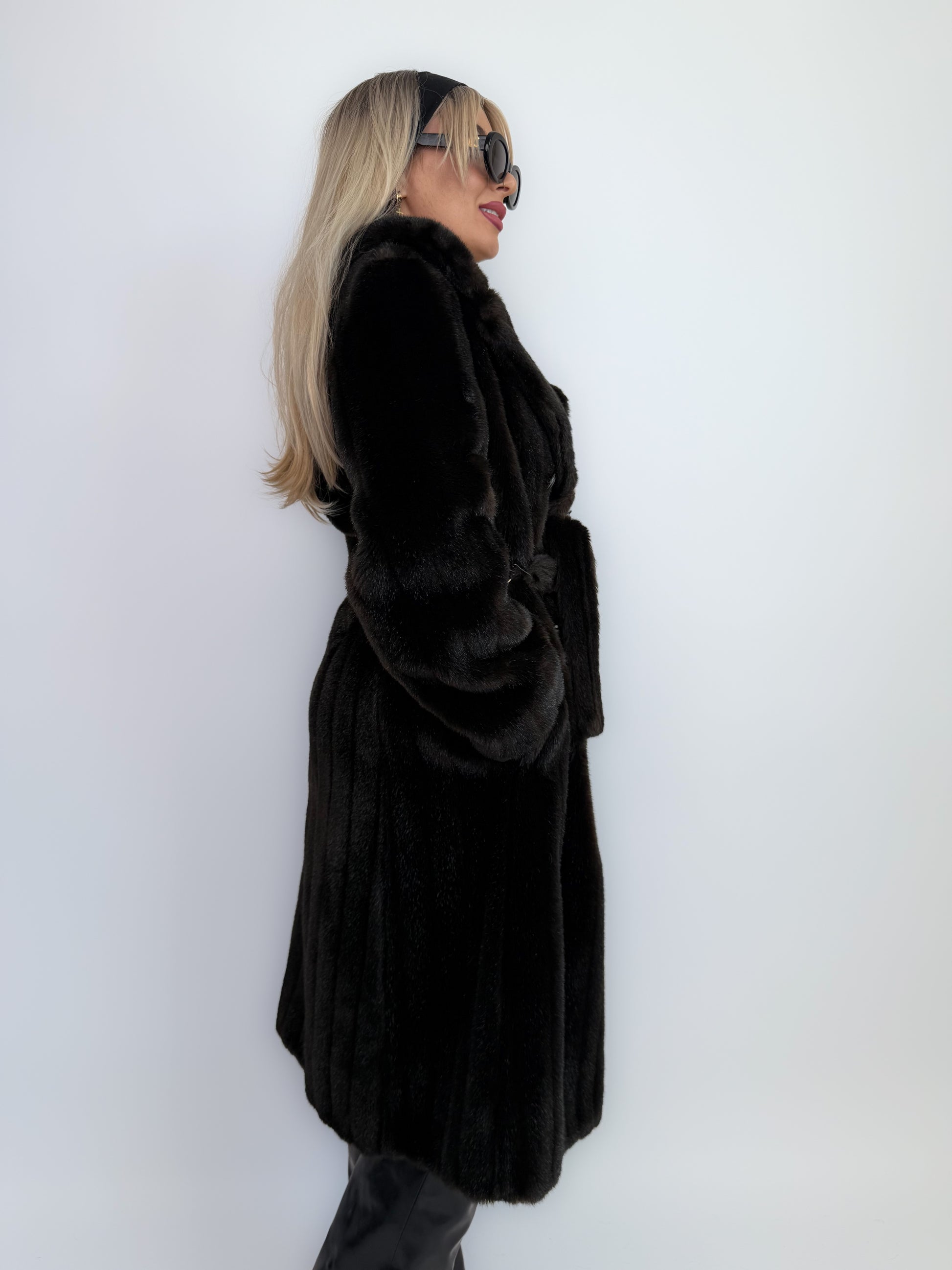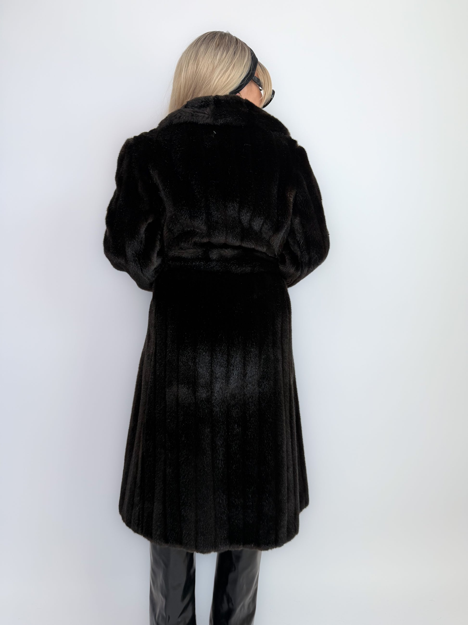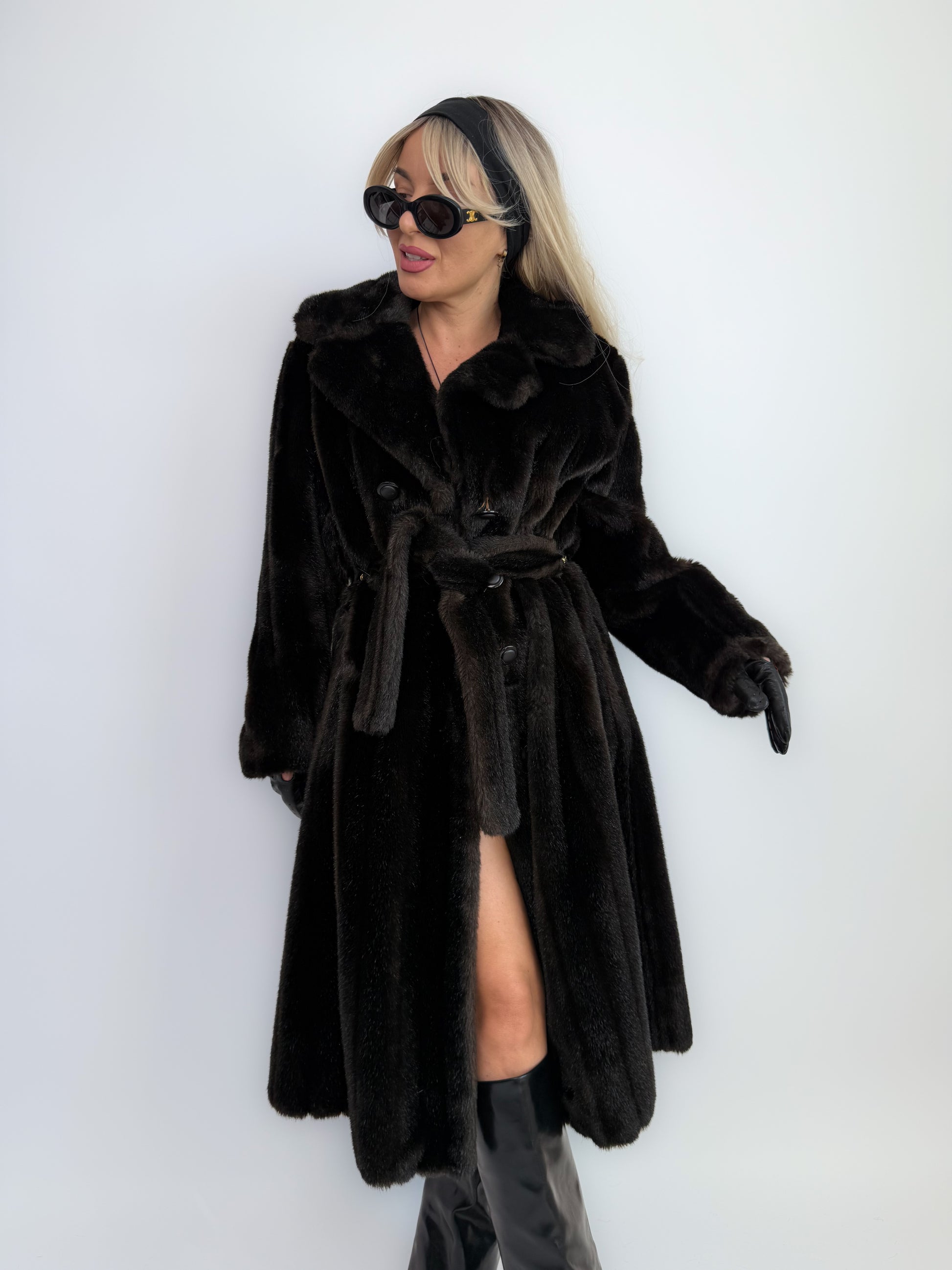 Vintage Faux Fur Coat Mid Length Winter Overcoat with Waist Tie Black - Size Small