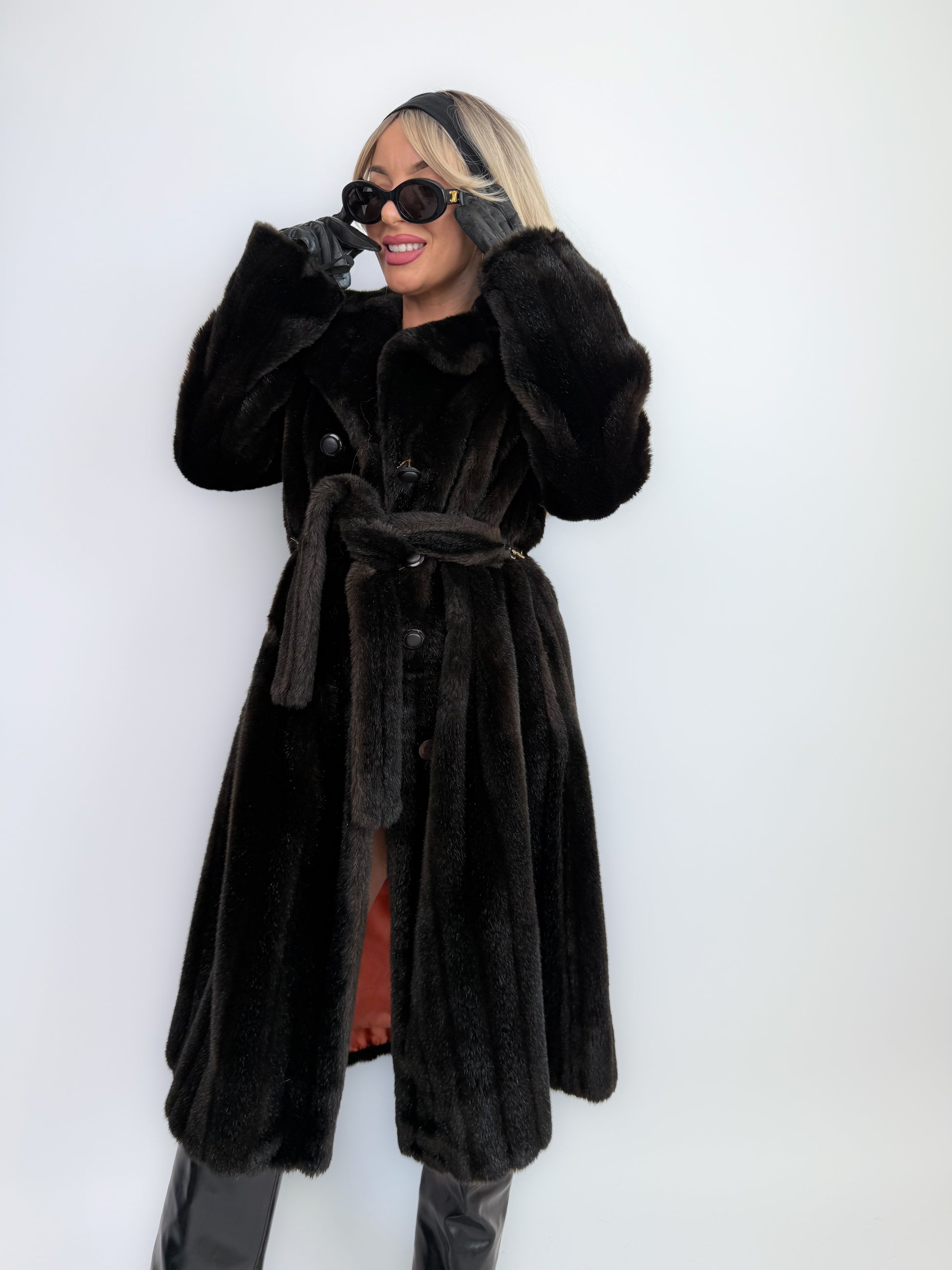 A statement-making vintage black faux fur coat with waist tie belt, v-neckline, and rich cognac lining. Its plush mid-length cut and structured shoulders give it timeless mob wife energy—perfect for bold winter looks and retro collectors.