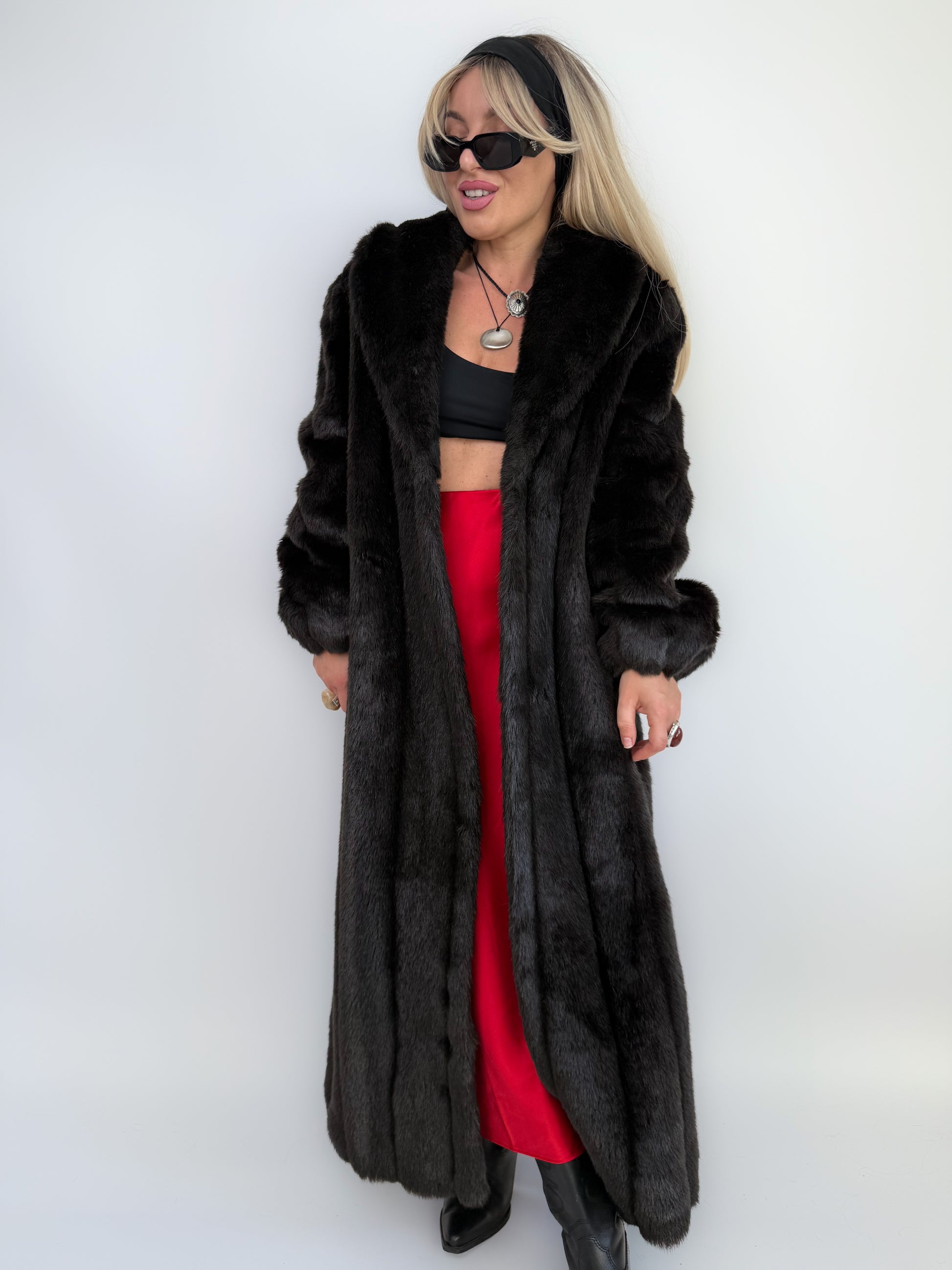 Vintage Black Faux Mink Full Length Winter Coat S-M