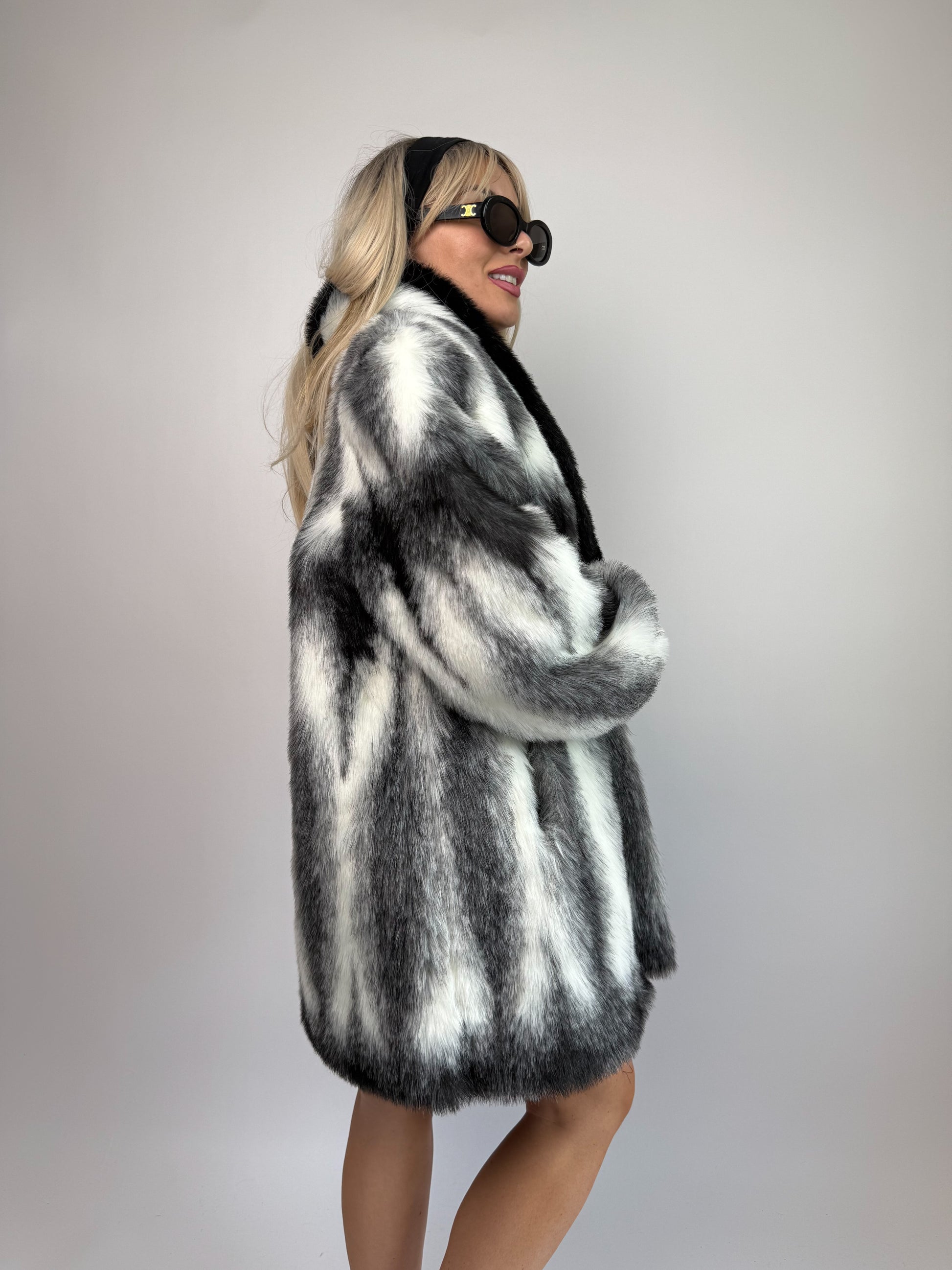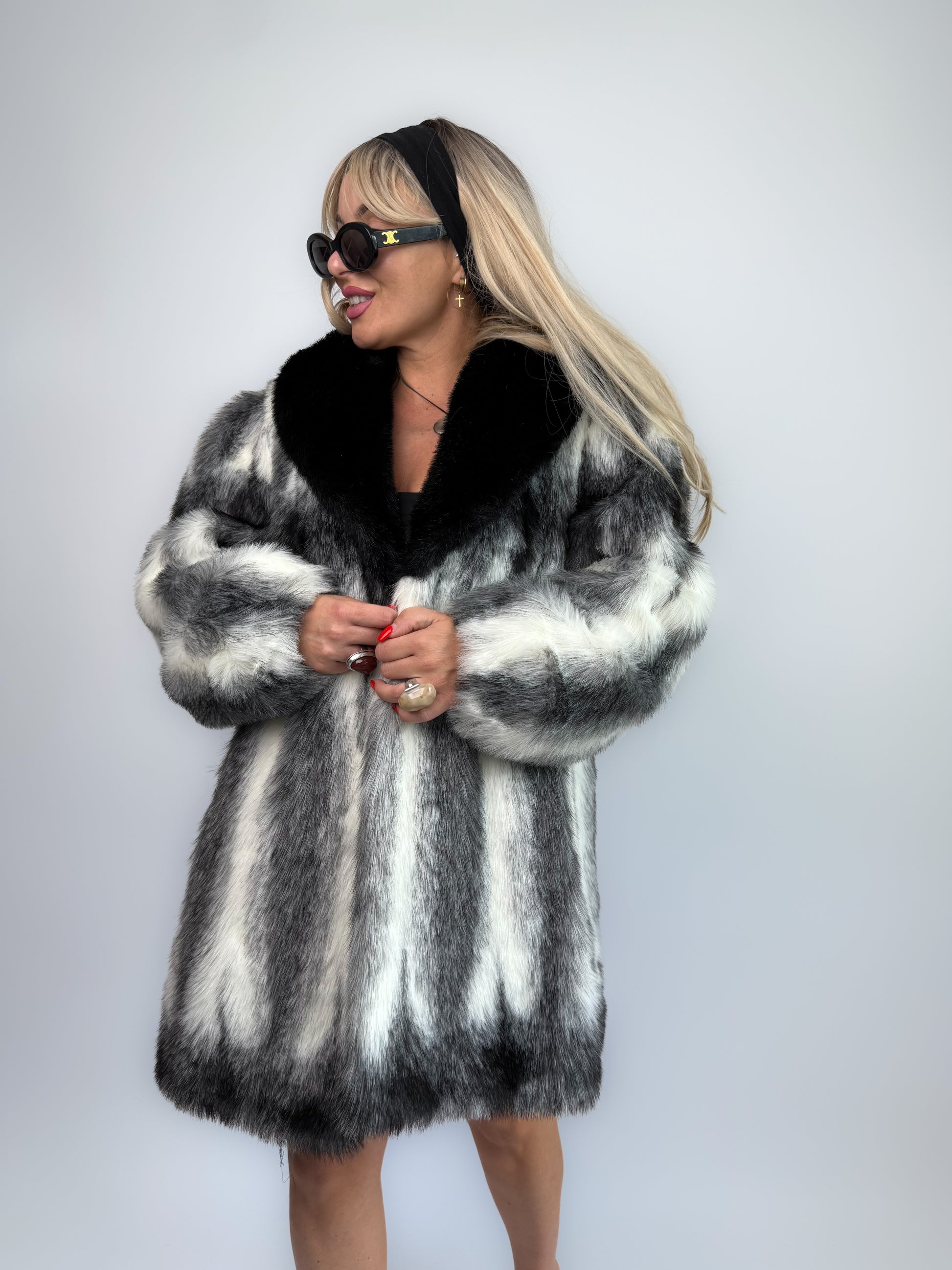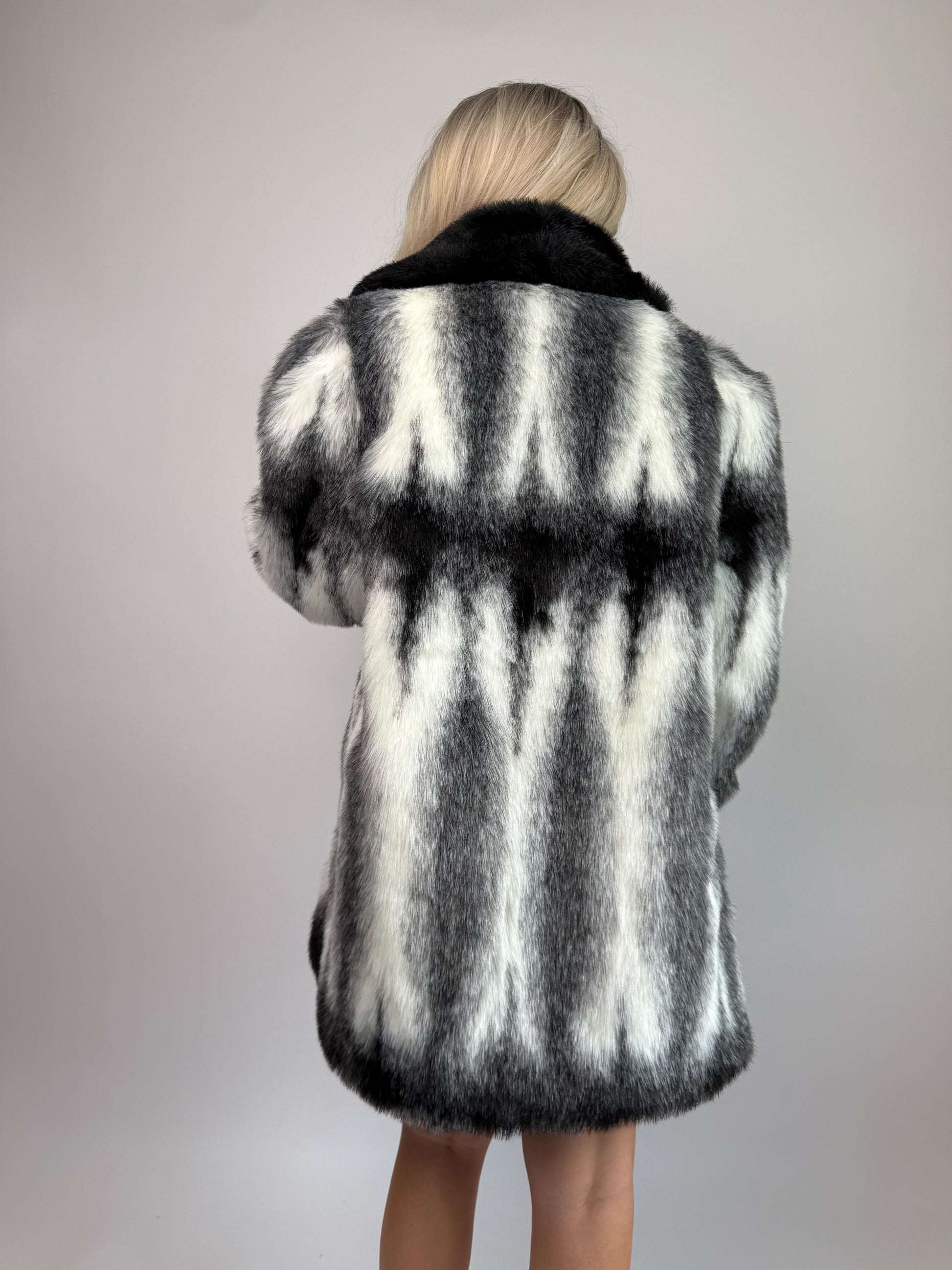 Vintage Black & White Faux Fur Coat: Striped Mid-Length Winter Jacket Mob Wife Festival Style – Size M L