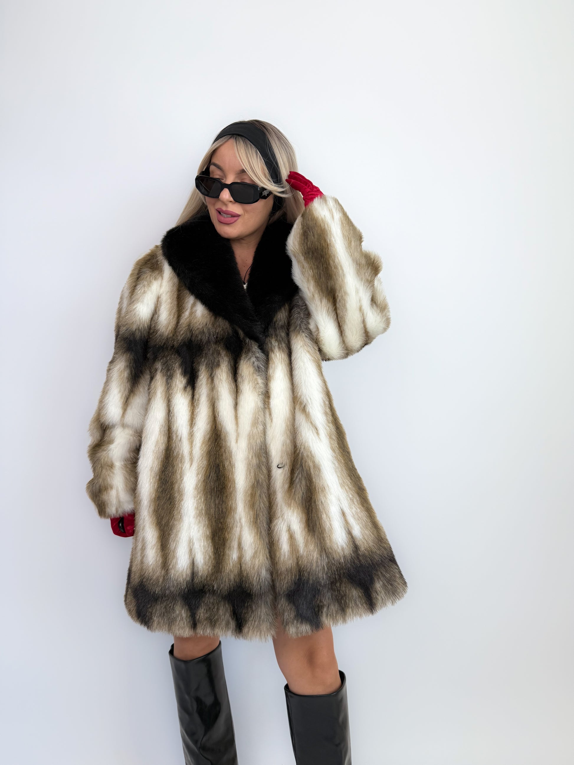 Vintage Striped Faux Fur Coat: Black & Beige Animal Print Mid-Length Winter Jacket L-XL
