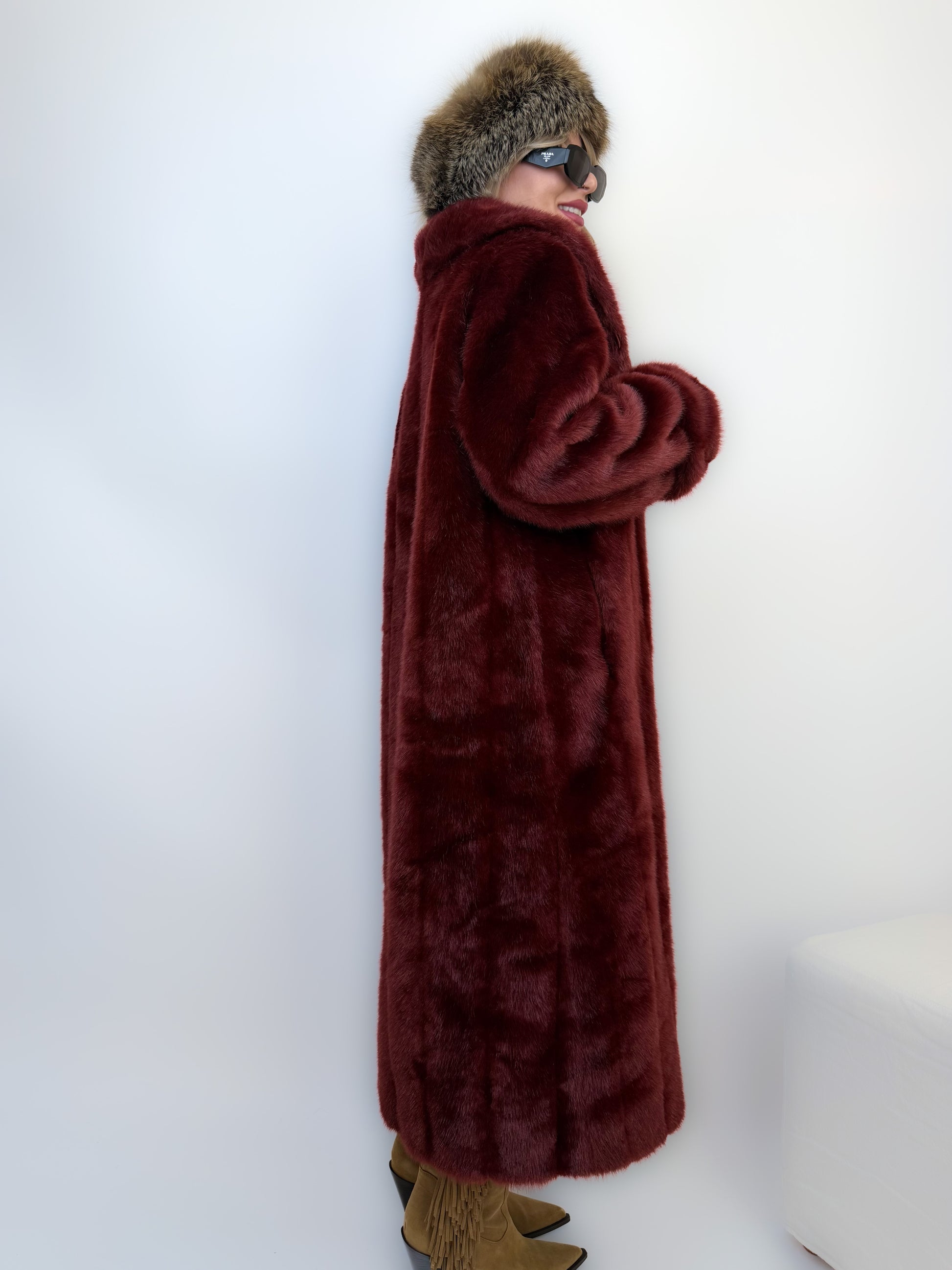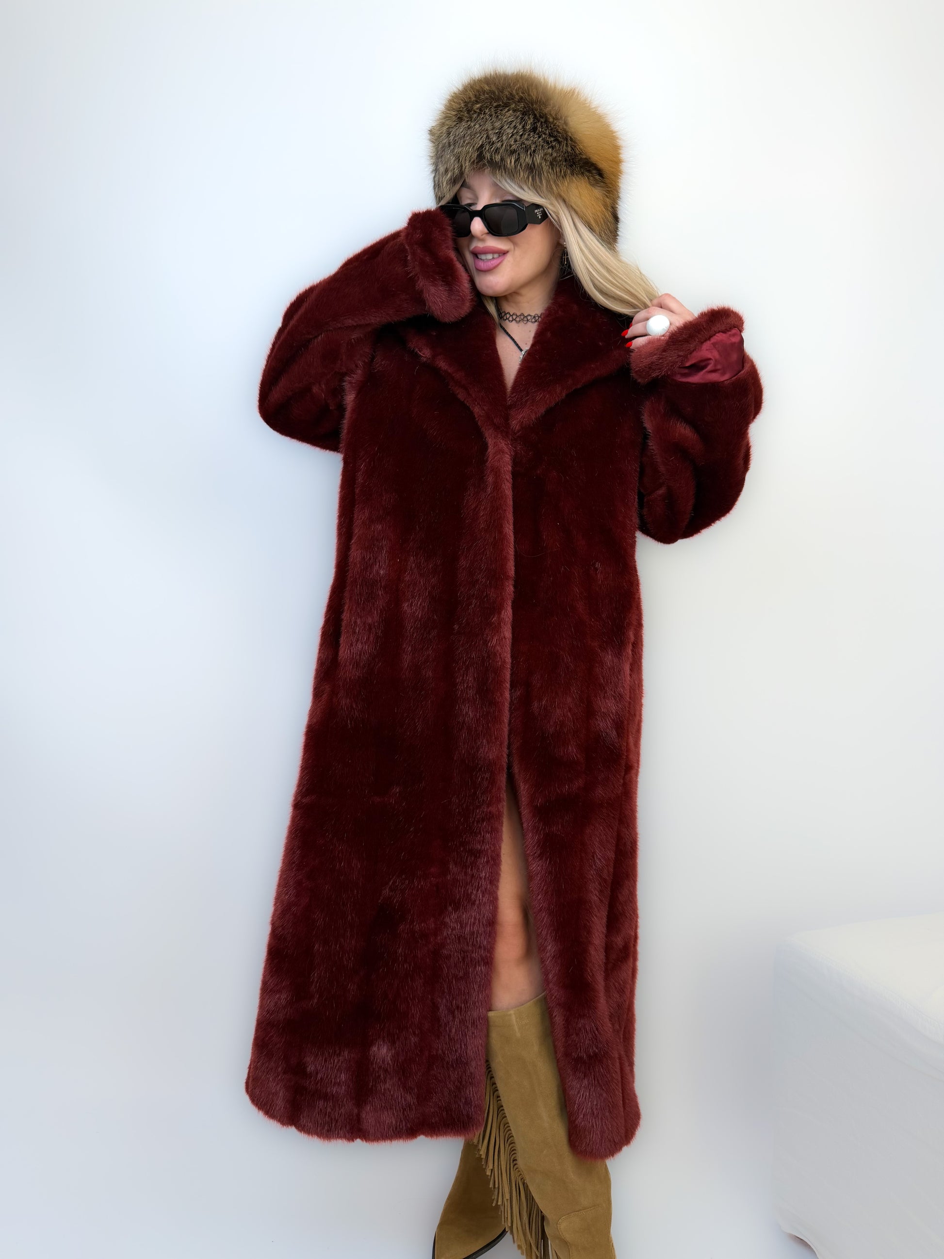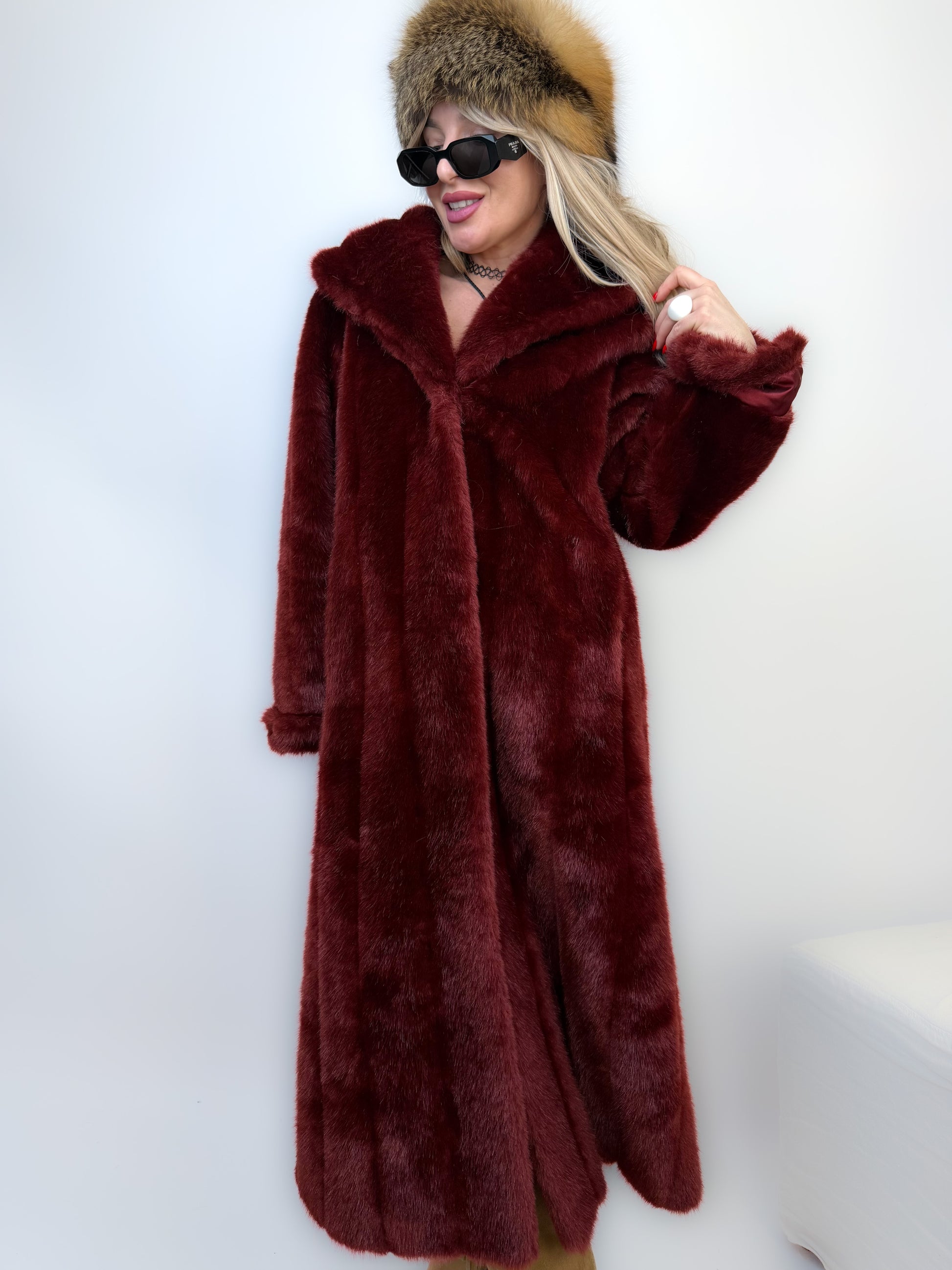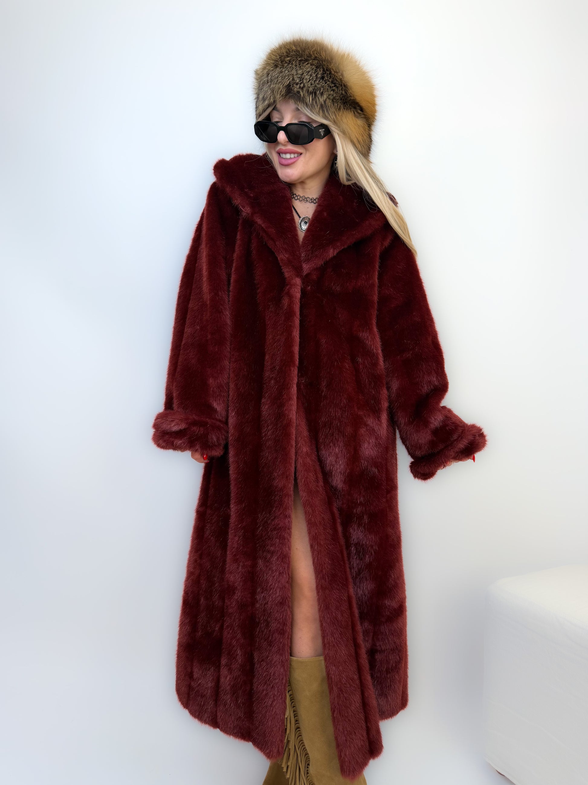 Deep burgundy faux fur, satin lining