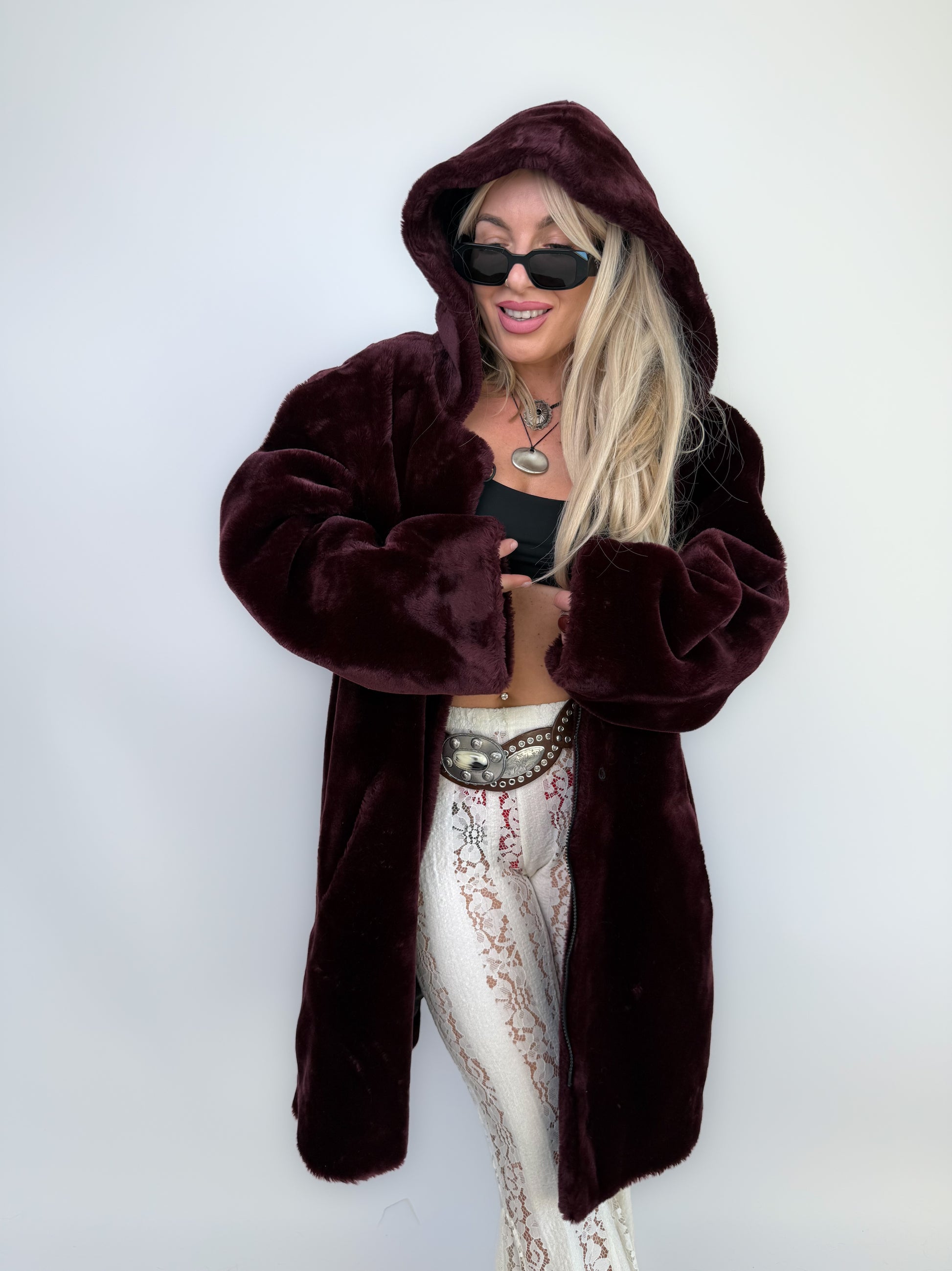 This vintage hooded faux fur coat in deep wine burgundy delivers plush texture and luxe drama. The oversized fit, padded shoulders, and warm satin lining make it a perfect blend of comfort and statement style — equally stunning with boots or heels.