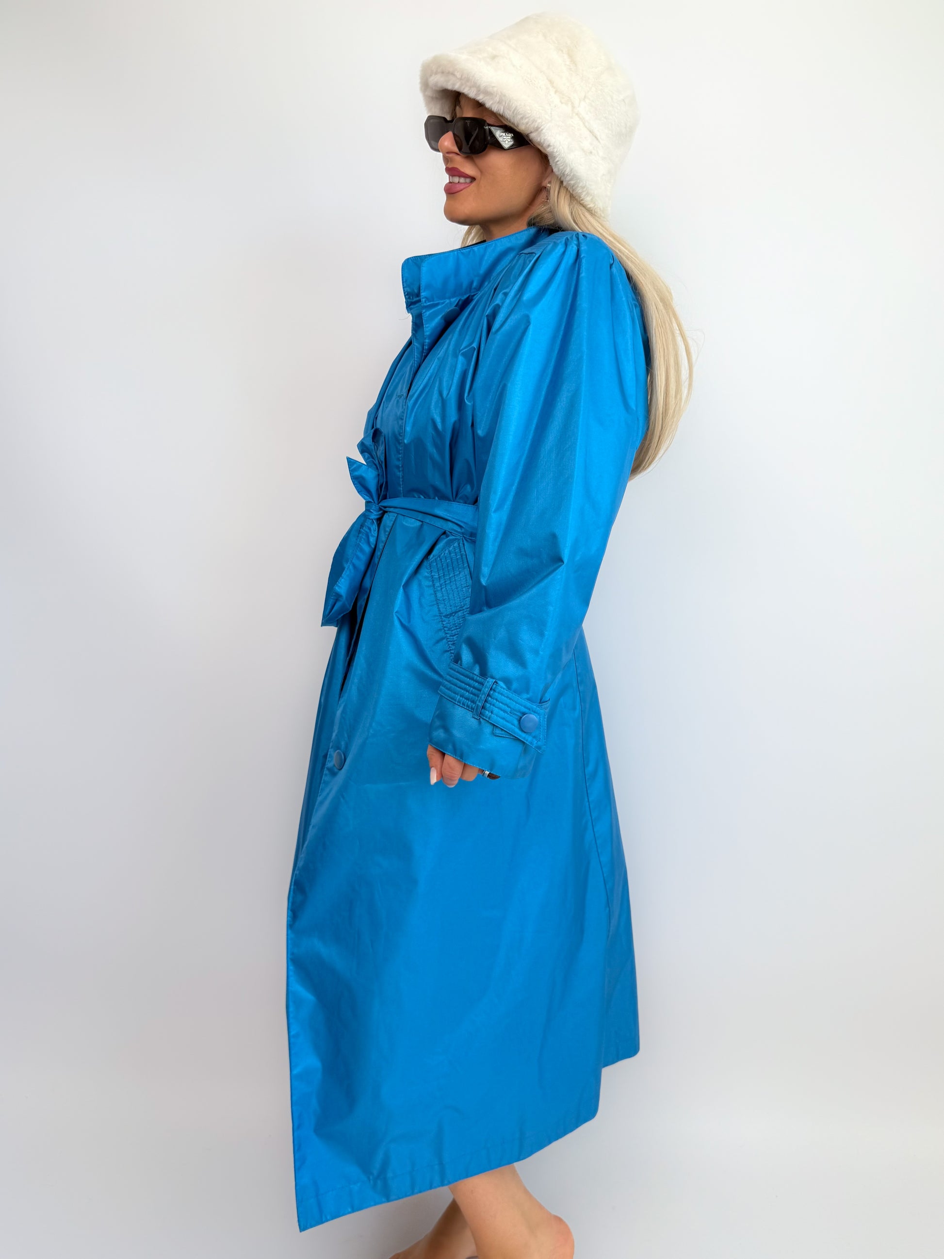 Turn every rainy day into a runway moment in this striking lazure blue vintage trench coat. Designed with a lightweight yet padded interior for extra warmth, this waterproof piece blends bold color with timeless tailoring. Shoulder pads give structure, while the belted waist adds definition for a flattering silhouette. A statement coat that turns heads and keeps you cozy at the same time.