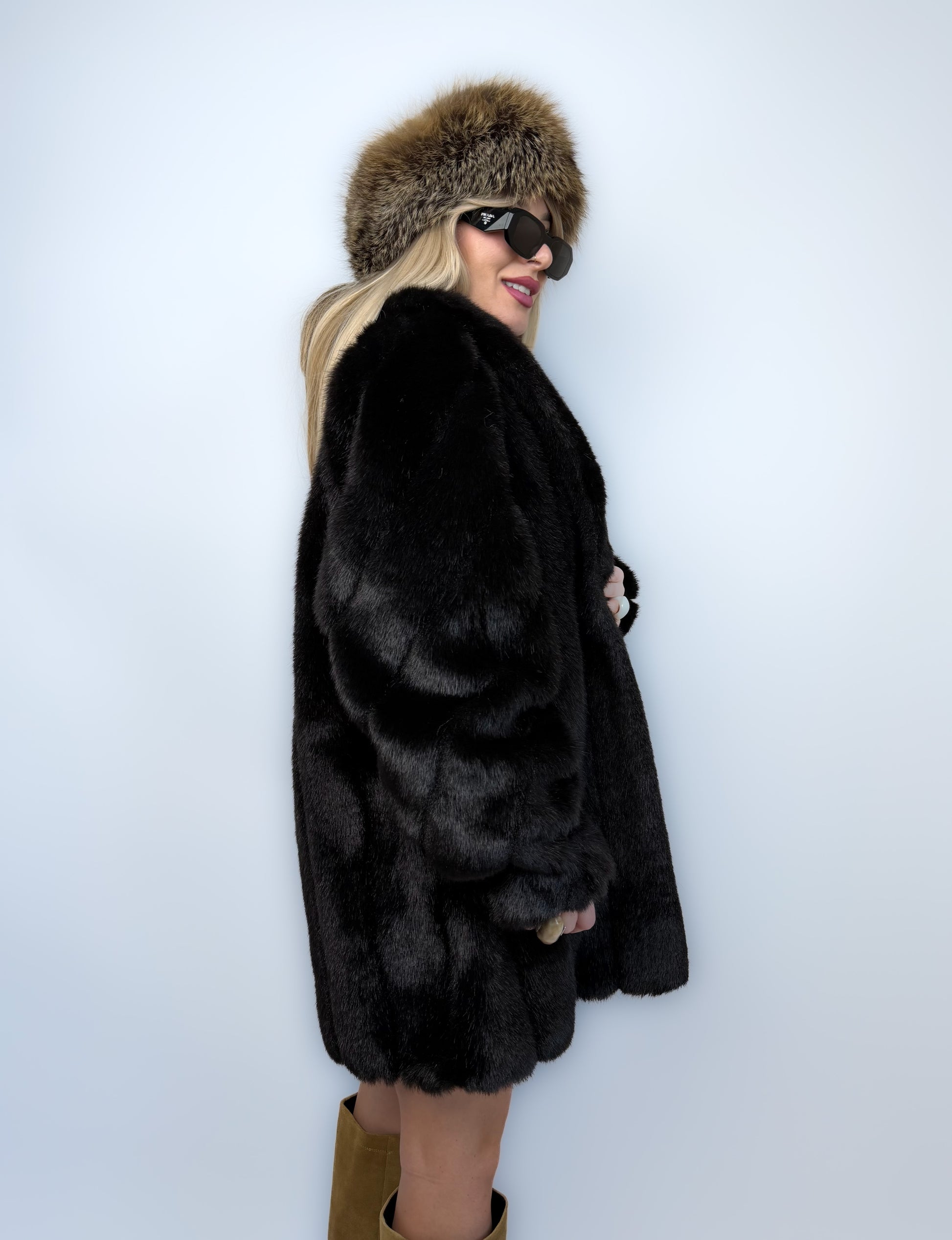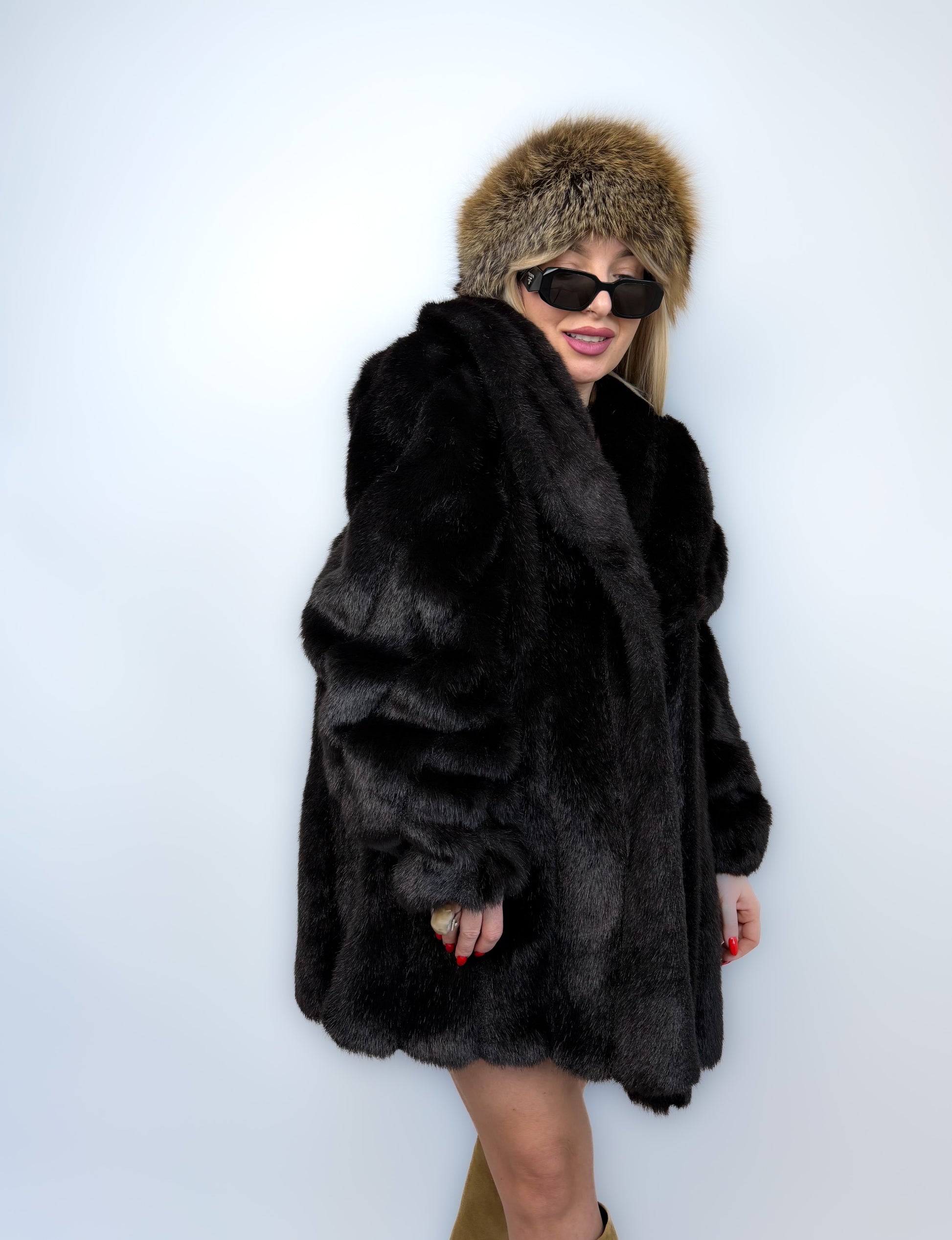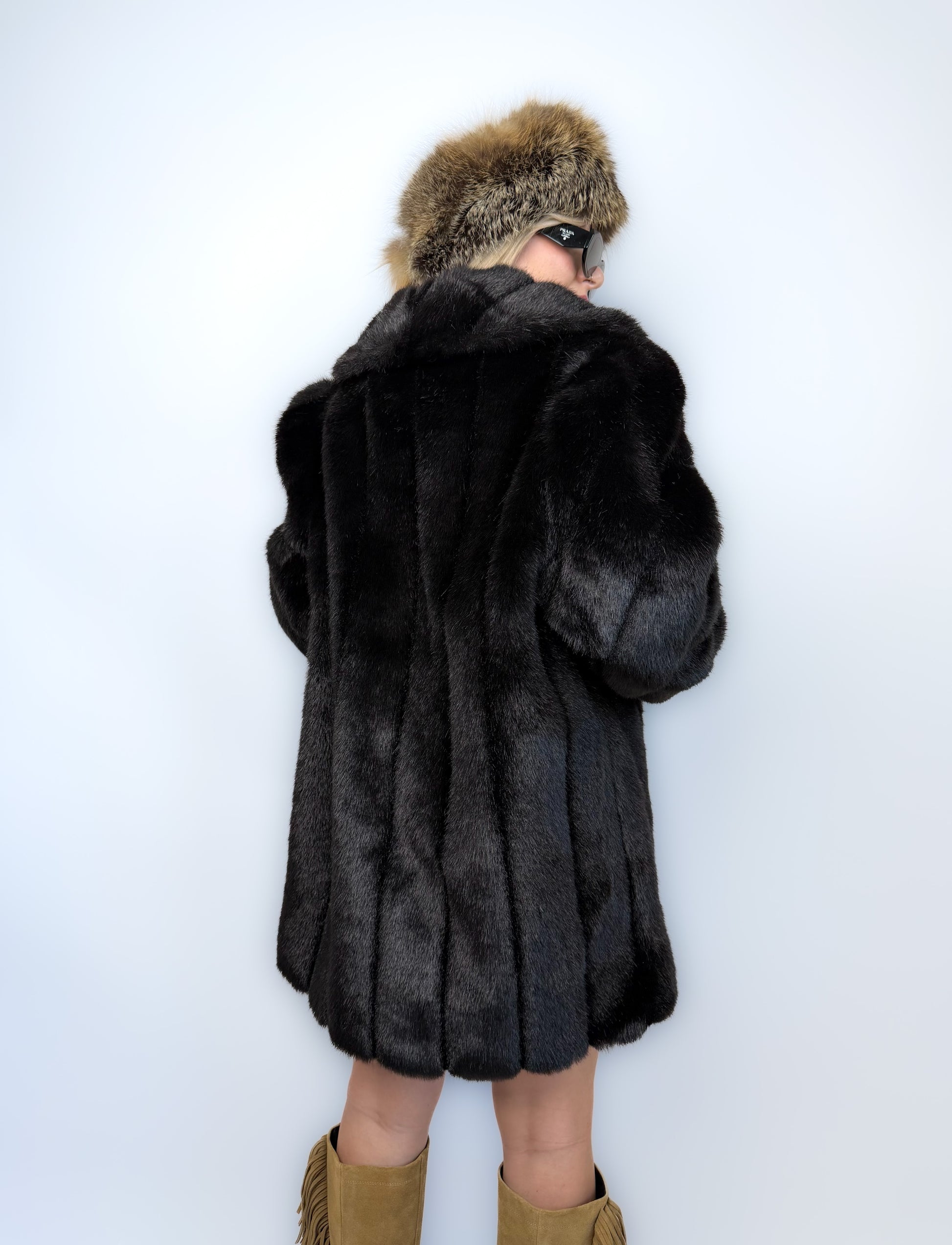 Vintage Faux Fur Mink Coat - Black Mid Length Winter Jacket S-M