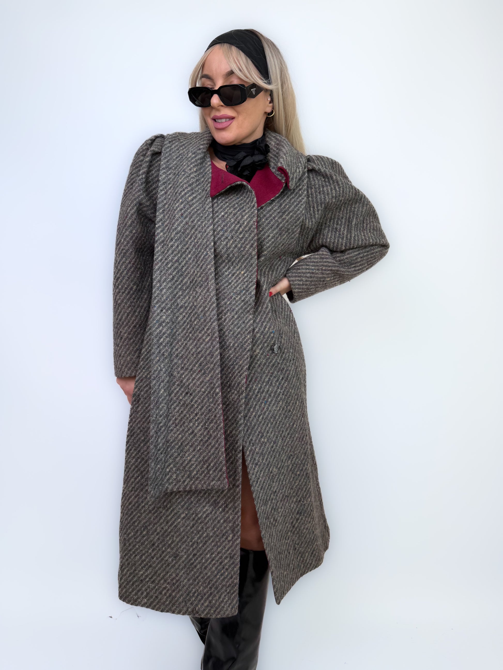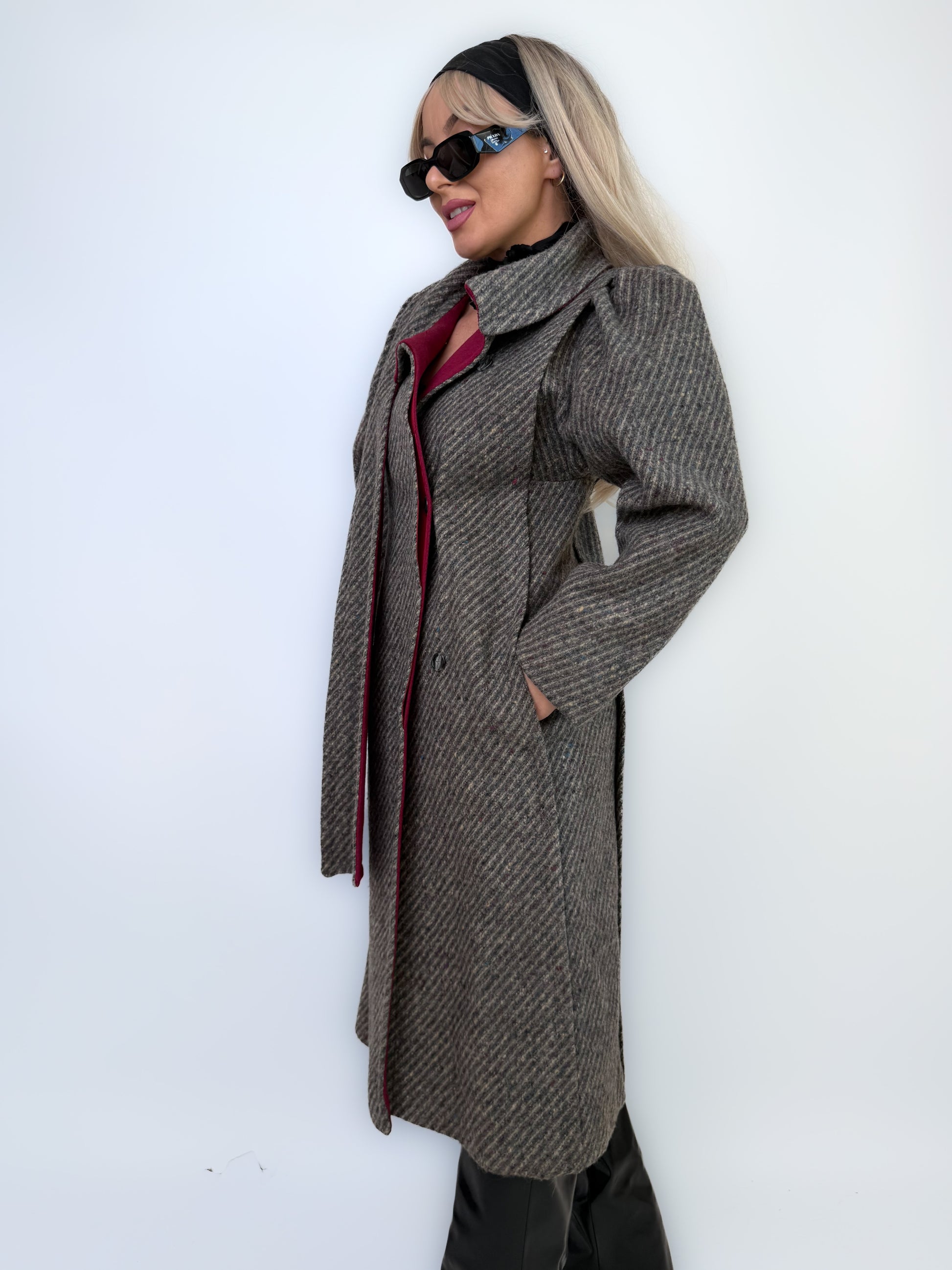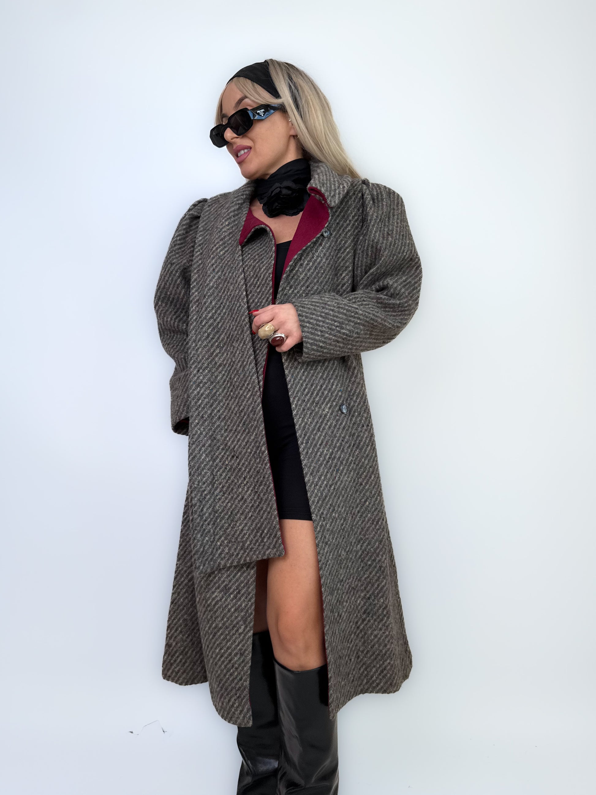 Classic meets bold. This herringbone wool coat combines timeless tailoring with a unique built-in scarf neckline and striking burgundy lining. Structured shoulders, soft texture, and flawless craftsmanship make it the kind of winter coat that turns every sidewalk into a runway.