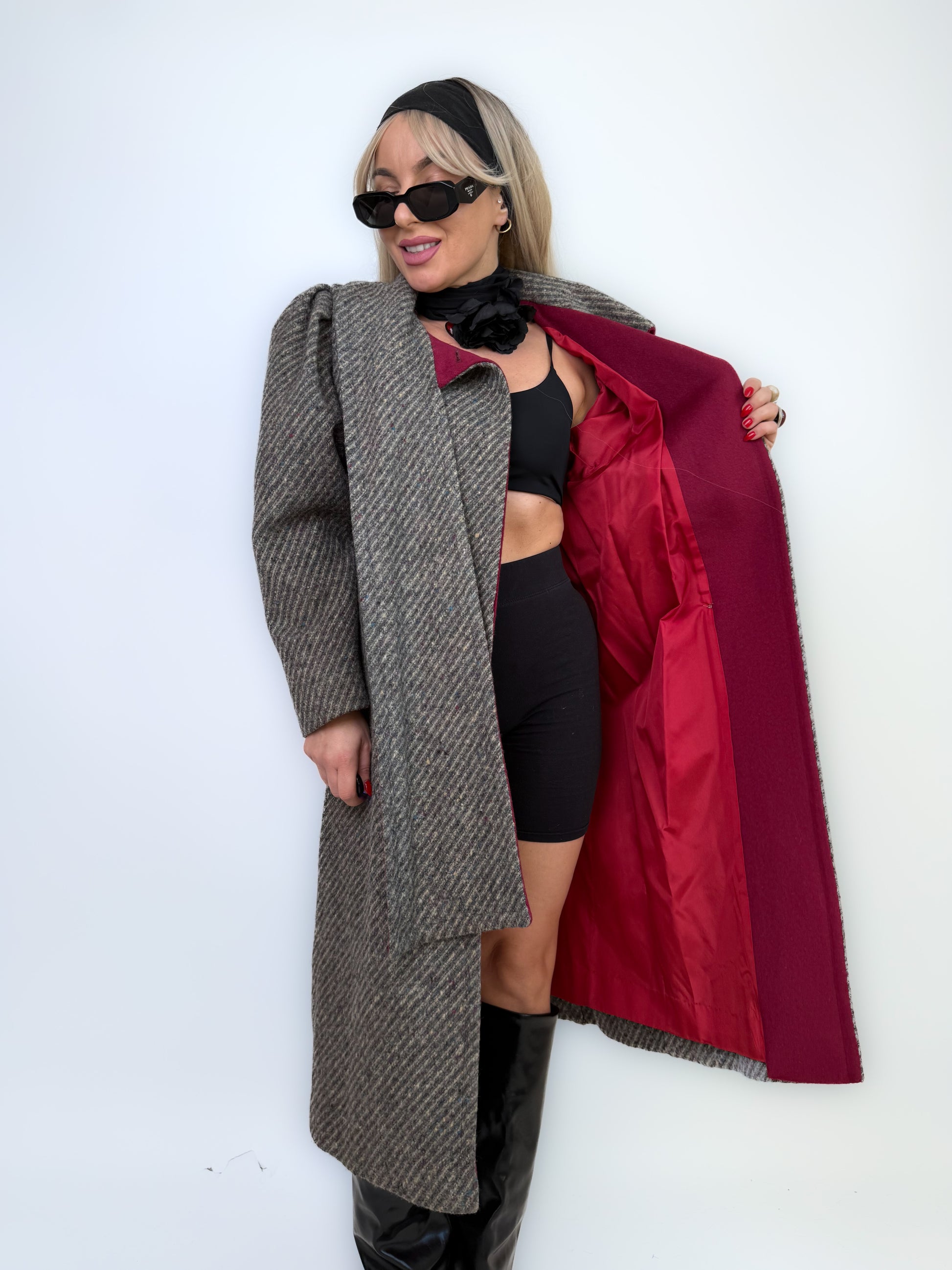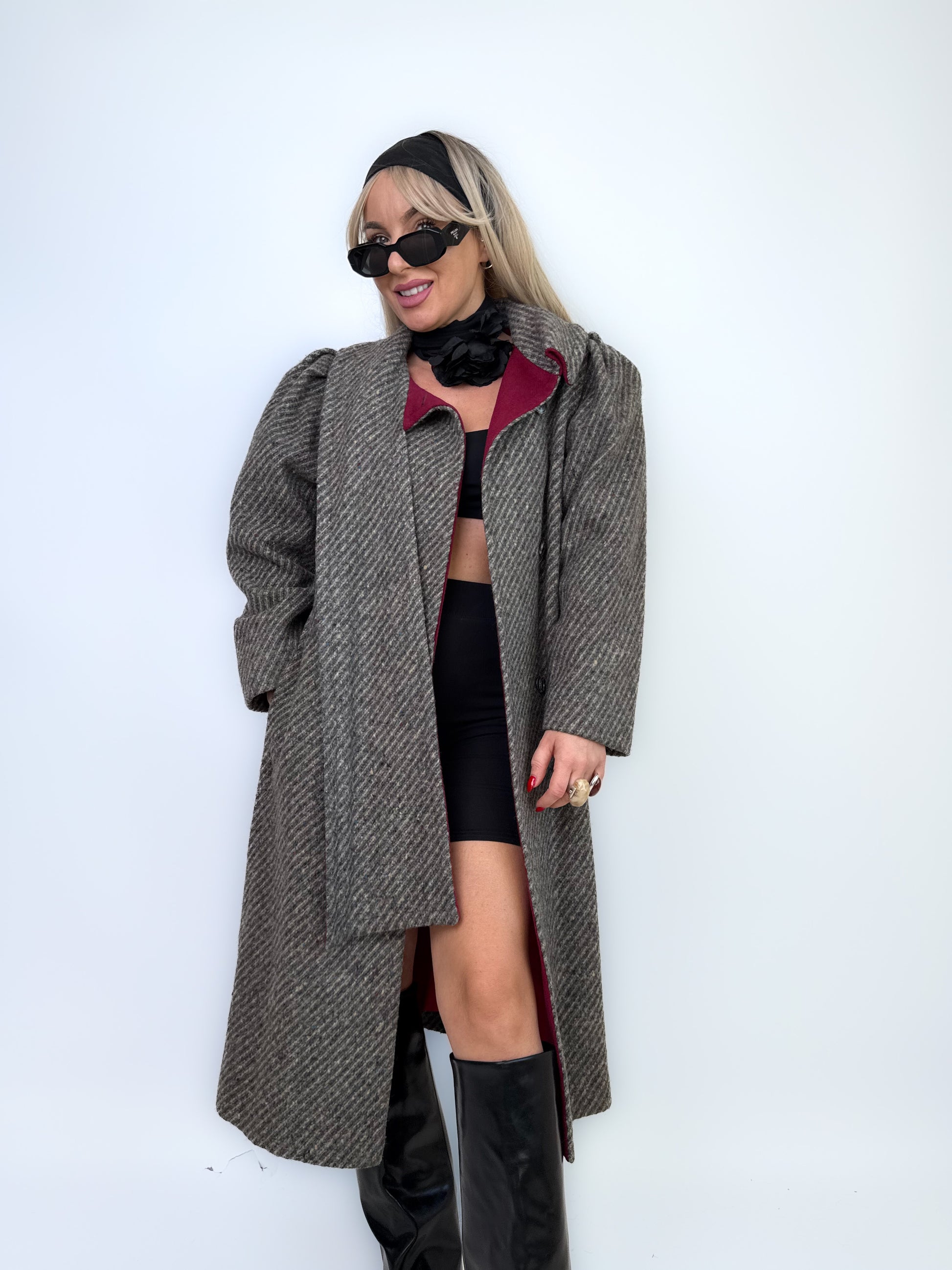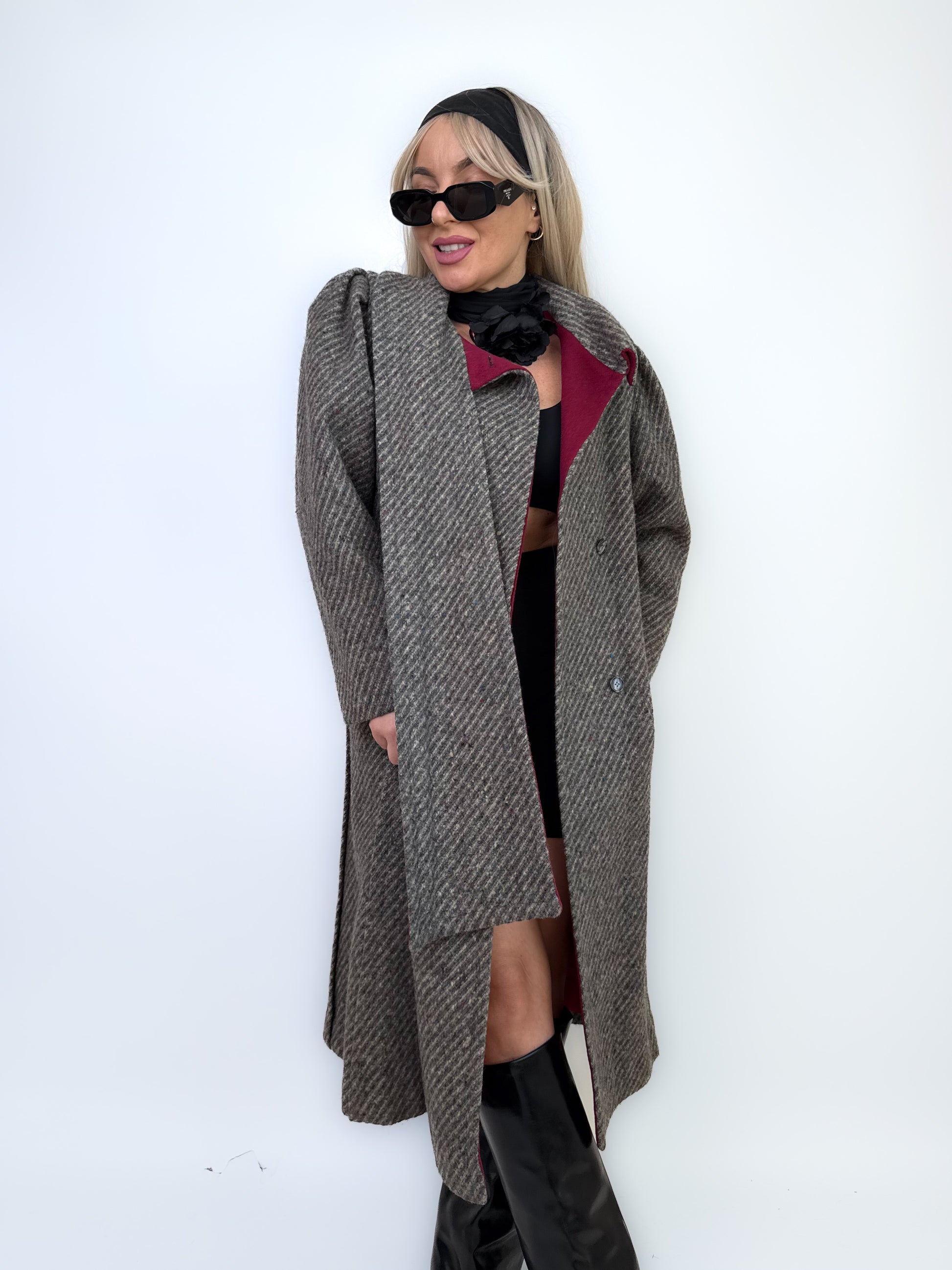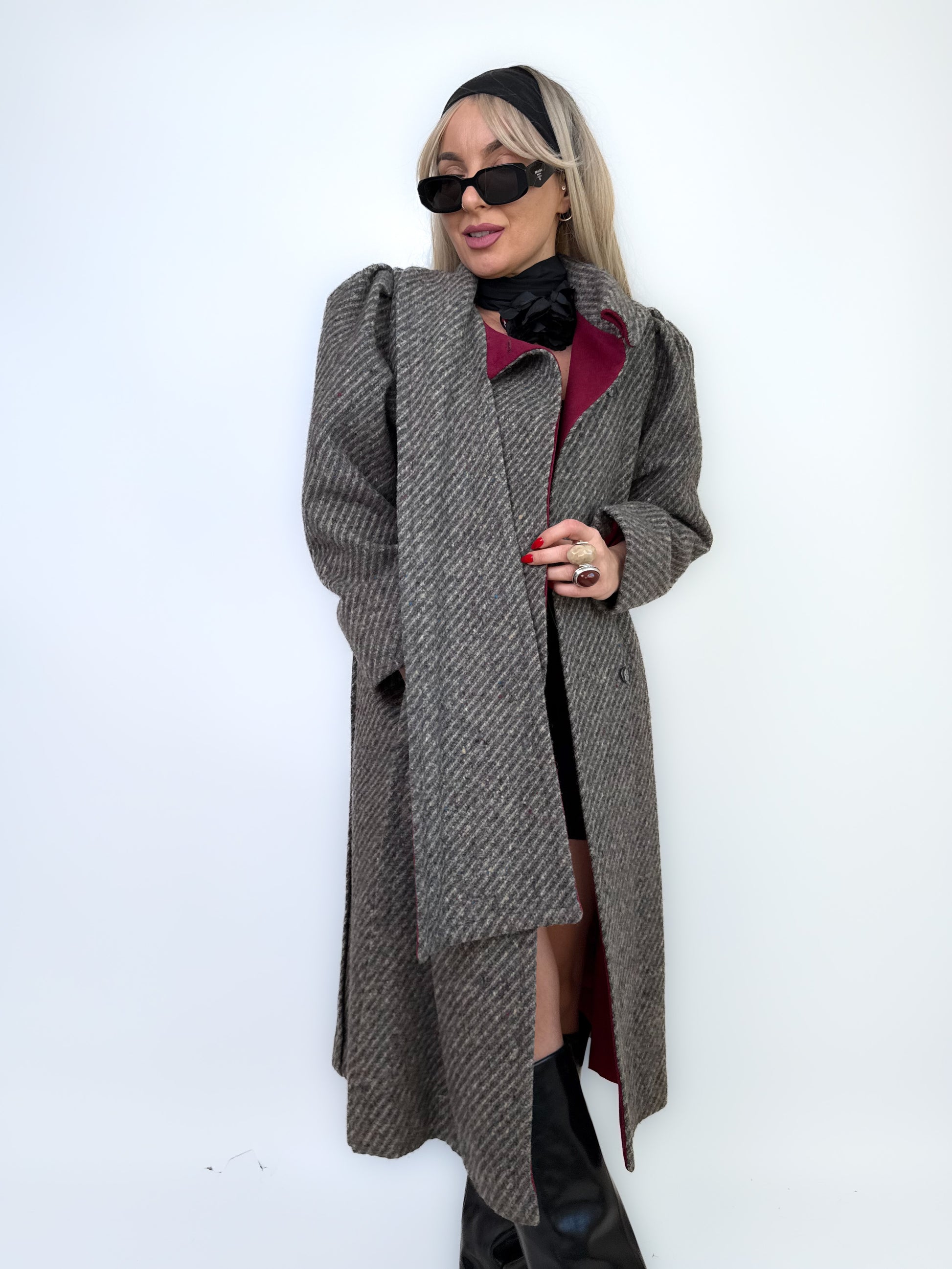 Classic meets bold. This herringbone wool coat combines timeless tailoring with a unique built-in scarf neckline and striking burgundy lining. Structured shoulders, soft texture, and flawless craftsmanship make it the kind of winter coat that turns every sidewalk into a runway.