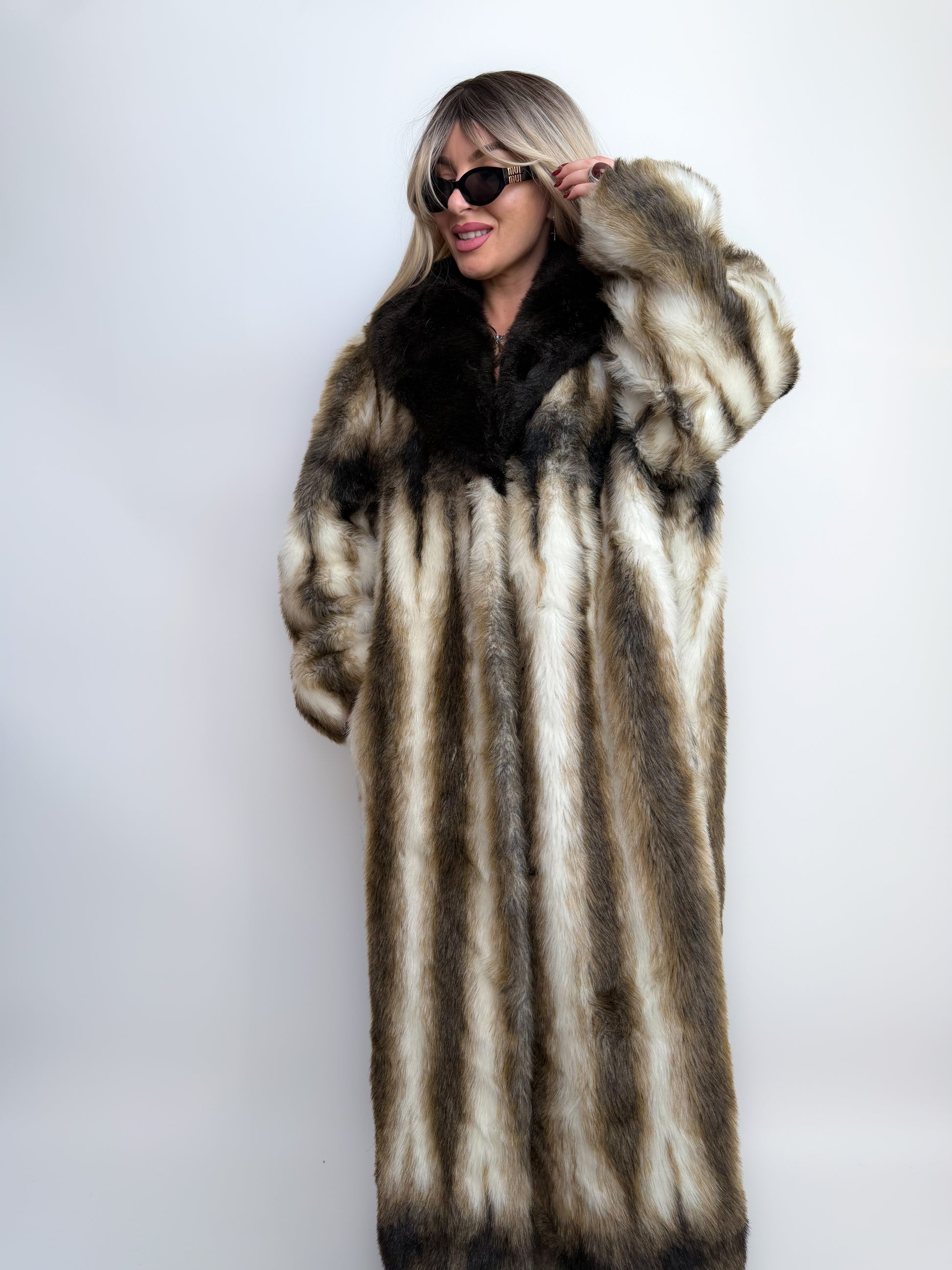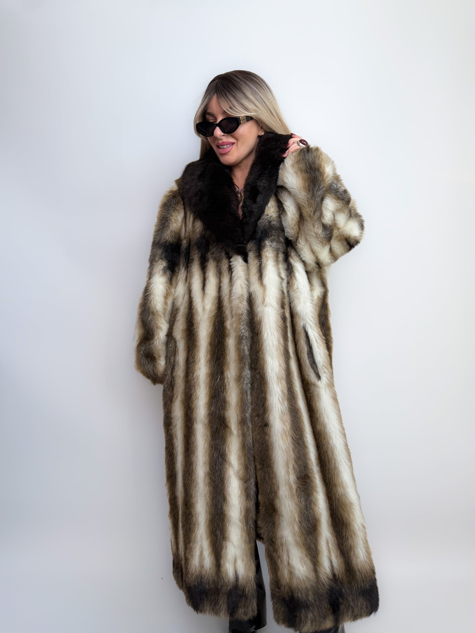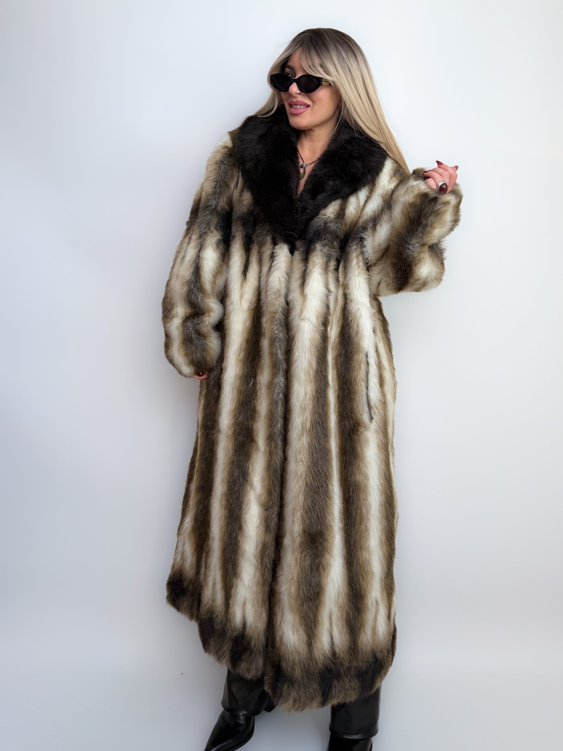 This Vintage Full-Length Striped Faux Fur Coat is a stunning USA-made statement designed for maximum warmth, softness, and dramatic winter style. The striped animal-print pattern creates a beautiful umbrella effect, adding movement and richness to the silhouette. This coat is warm, heavy, and perfect for freezing temperatures.