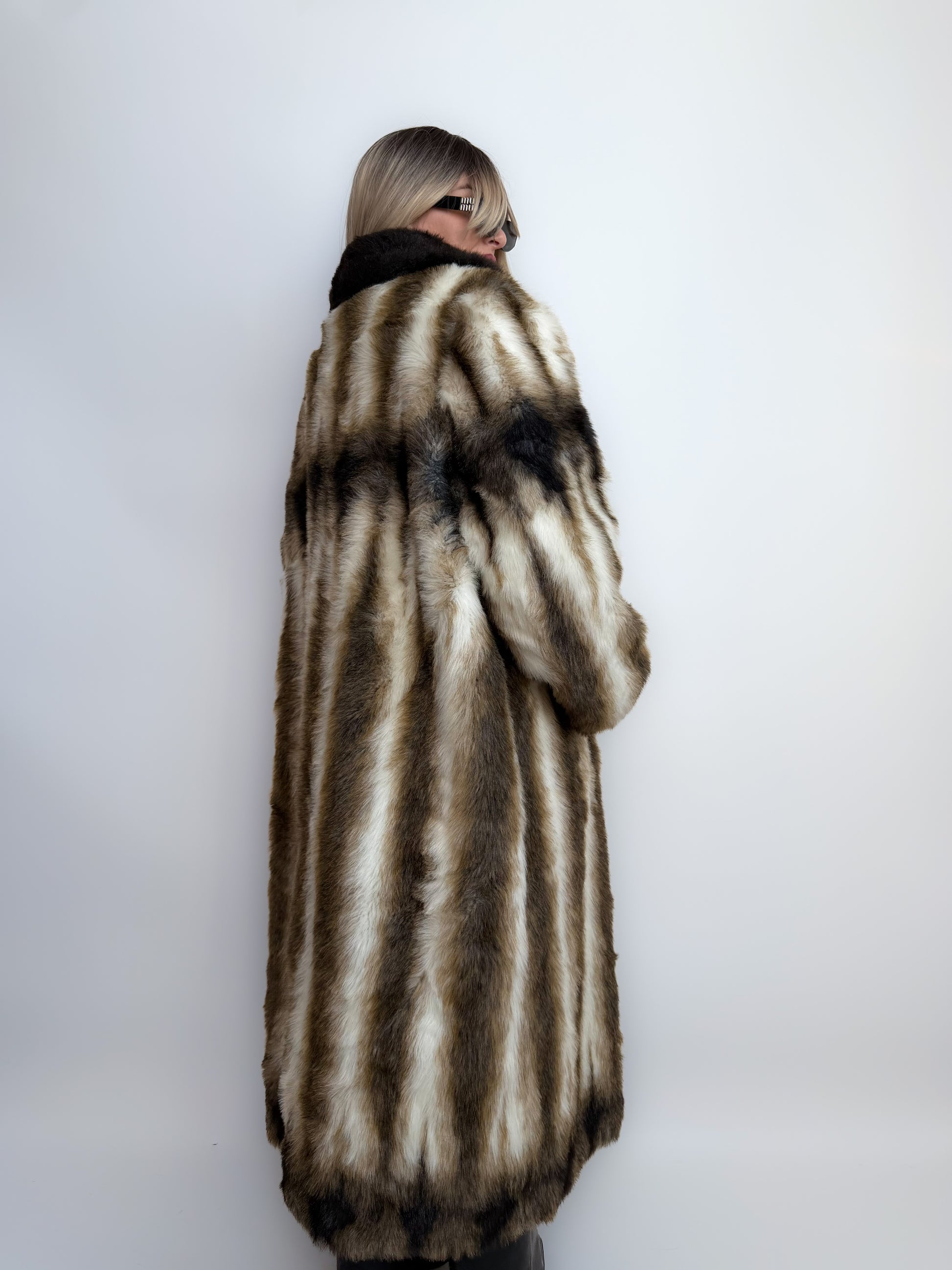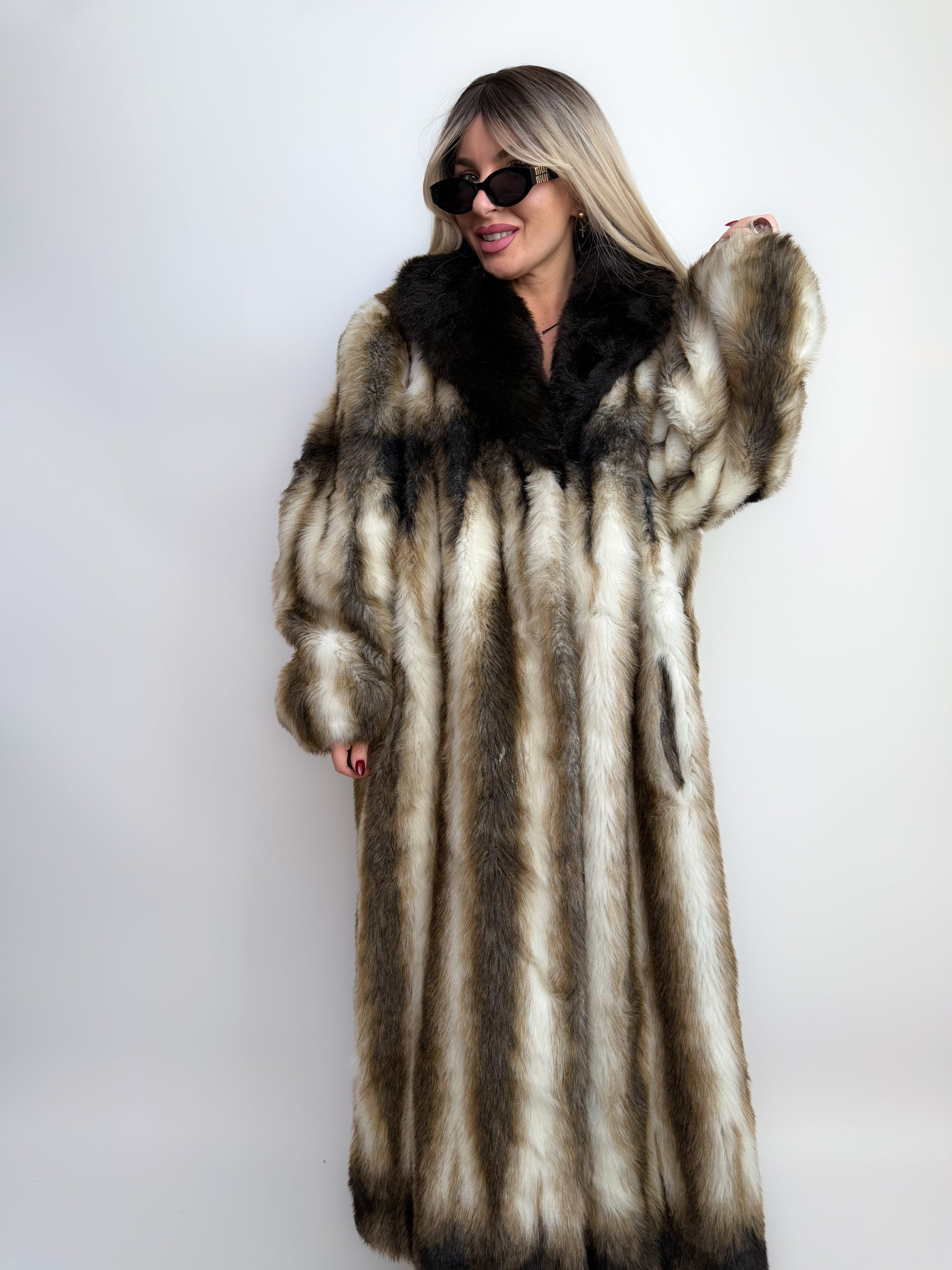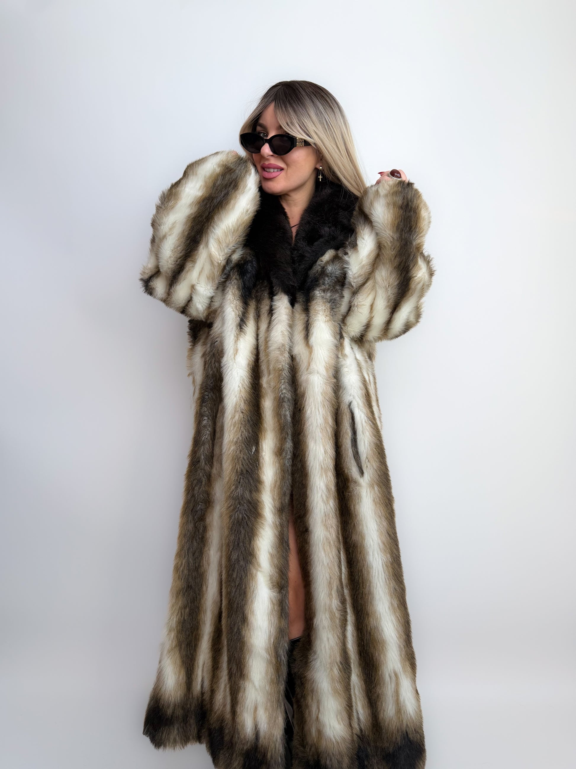 This Vintage Full-Length Striped Faux Fur Coat is a stunning USA-made statement designed for maximum warmth, softness, and dramatic winter style. The striped animal-print pattern creates a beautiful umbrella effect, adding movement and richness to the silhouette. This coat is warm, heavy, and perfect for freezing temperatures.