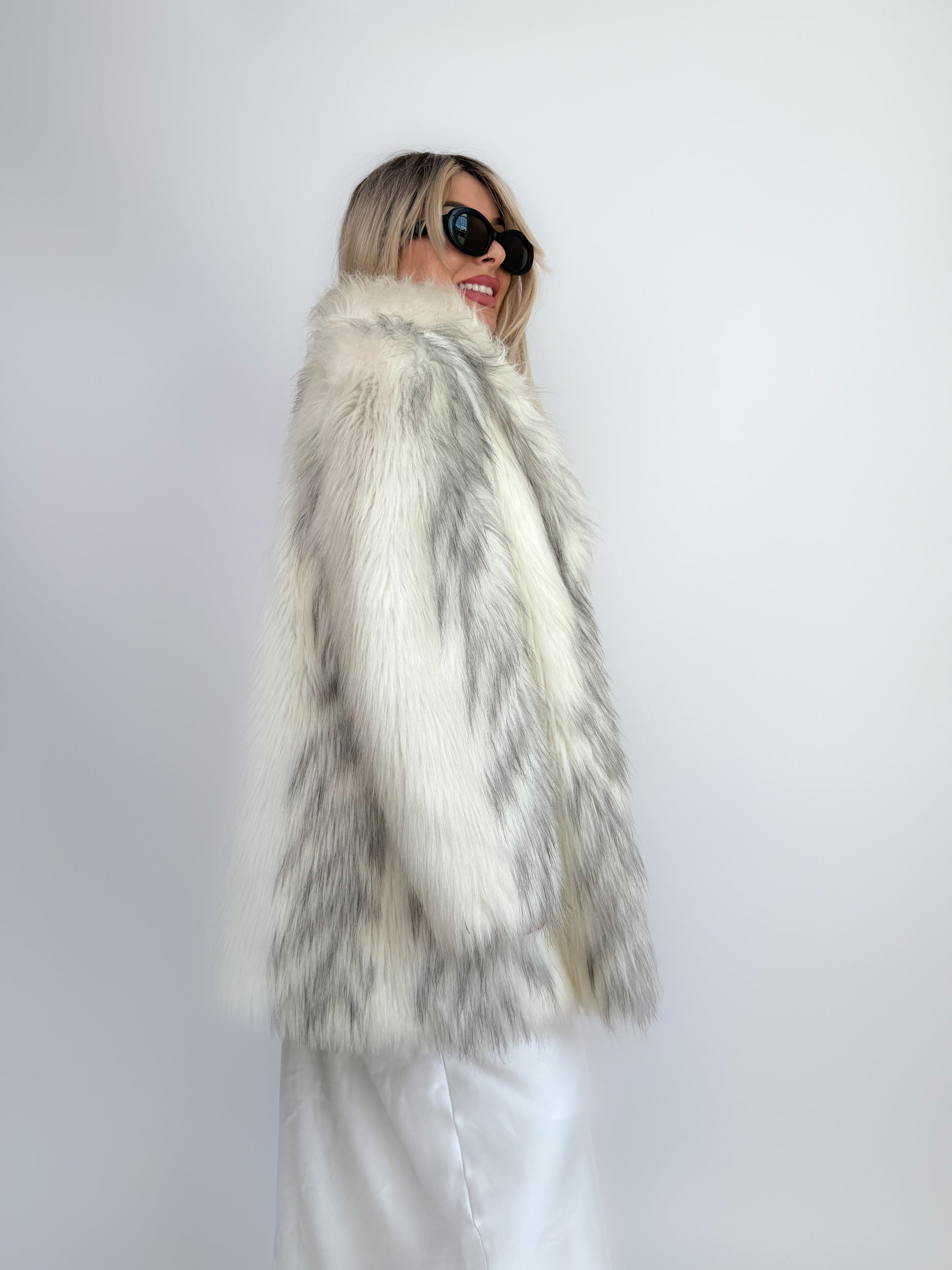 Elevate your winter wardrobe with this timeless ivory and gray faux fur coat. Perfect for a glamorous winter bride or anyone seeking chic cold-weather drama, it features side pockets, hook closure, and a plush fully lined finish. A true vintage showstopper.