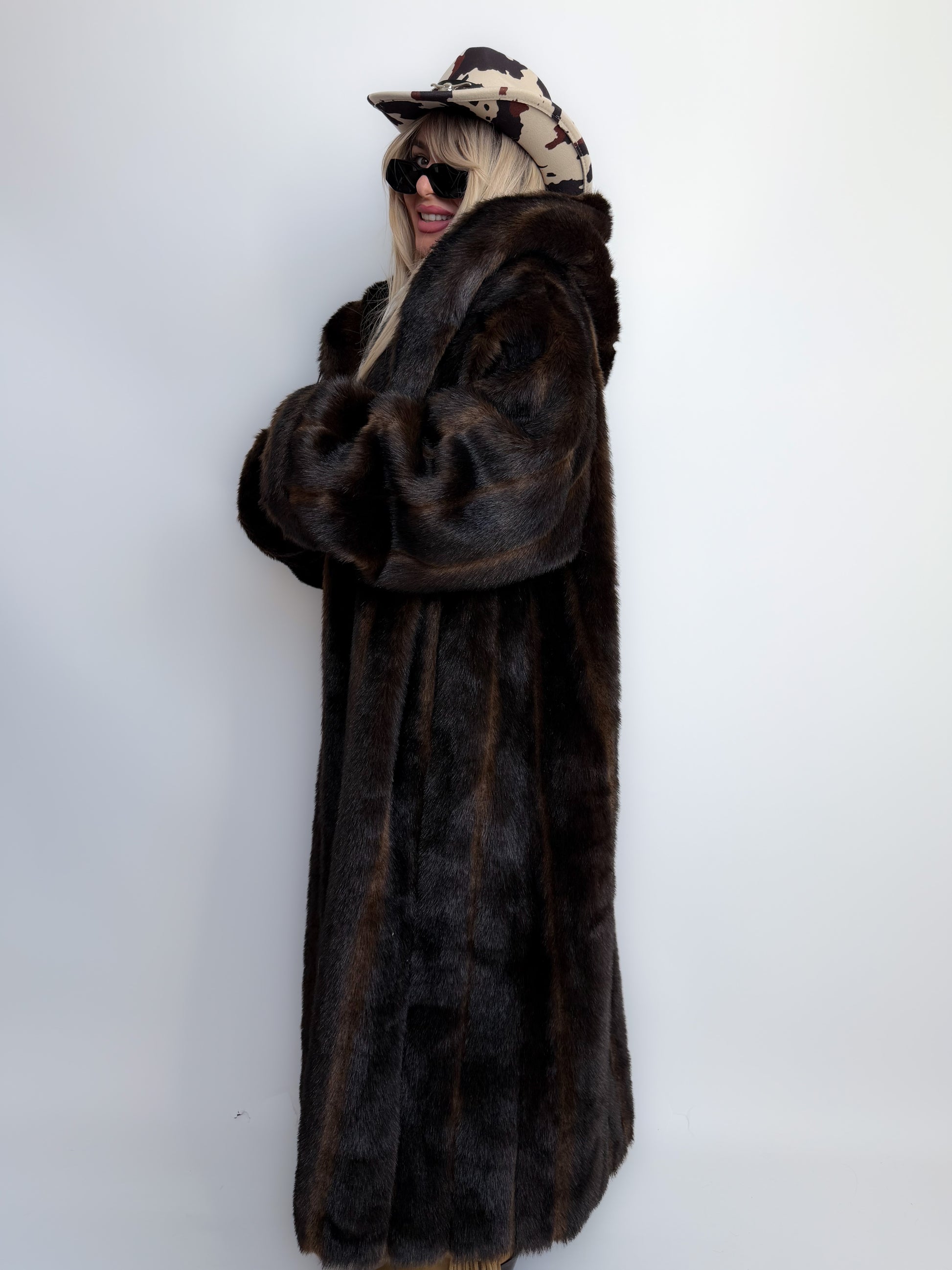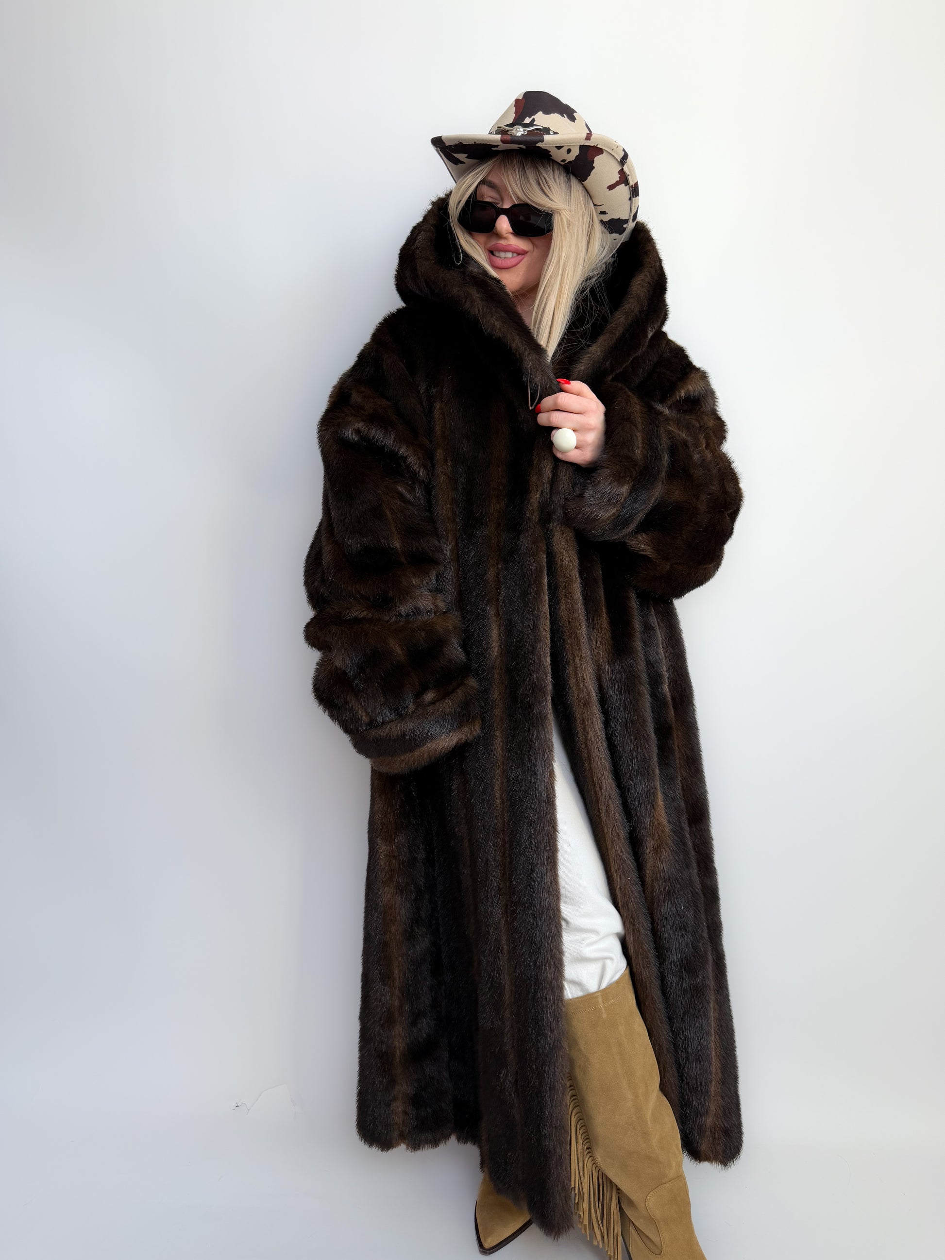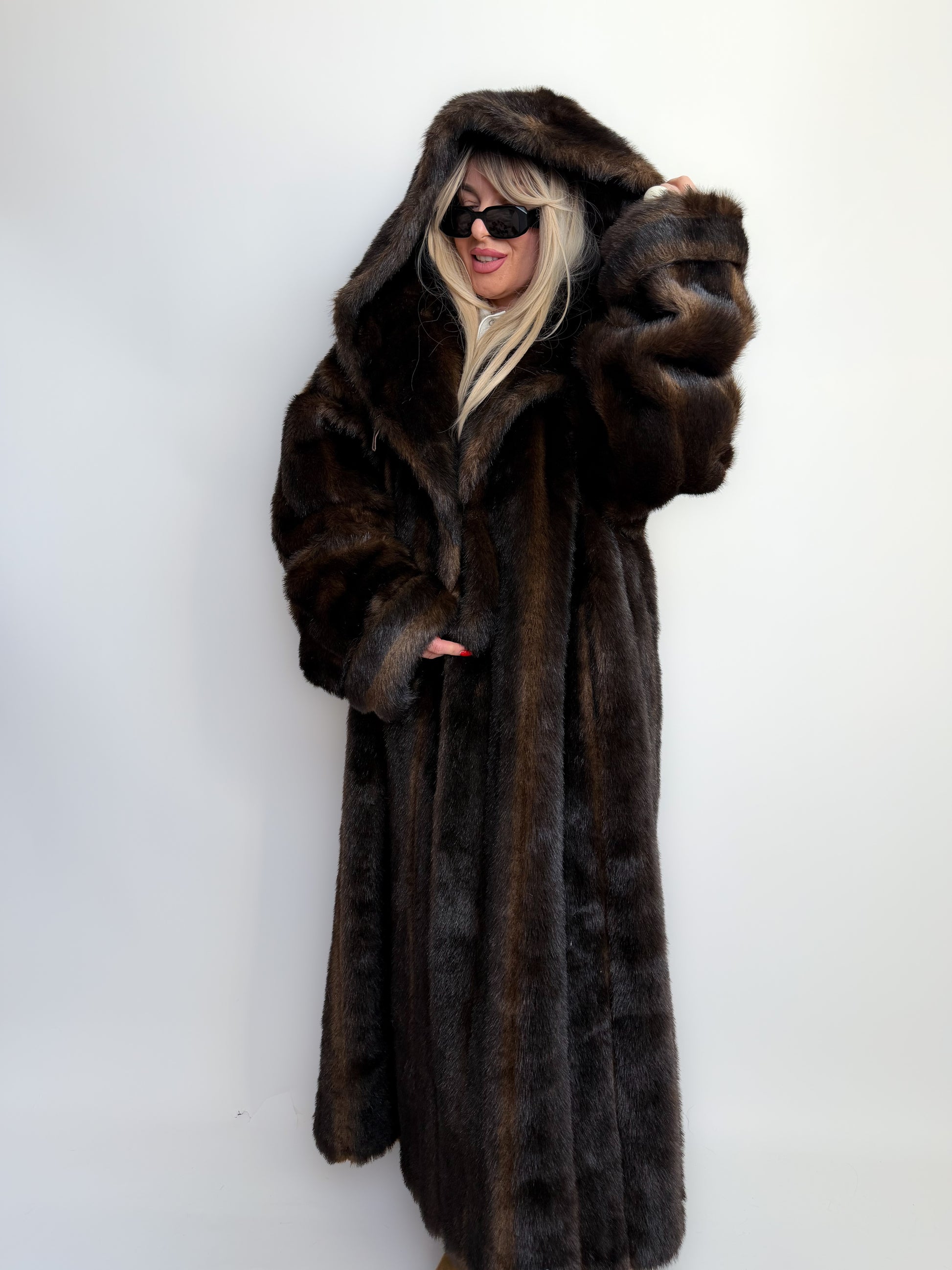 This vintage faux fur coat is pure winter luxury. Designed in a deep, rich brown tone with a dramatic full-length silhouette, it delivers warmth, presence, and timeless glam. The oversized fit, plush texture, and hooded design make it both striking and wearable. A rare, one-of-a-kind statement piece made for cold days when you want maximum impact.