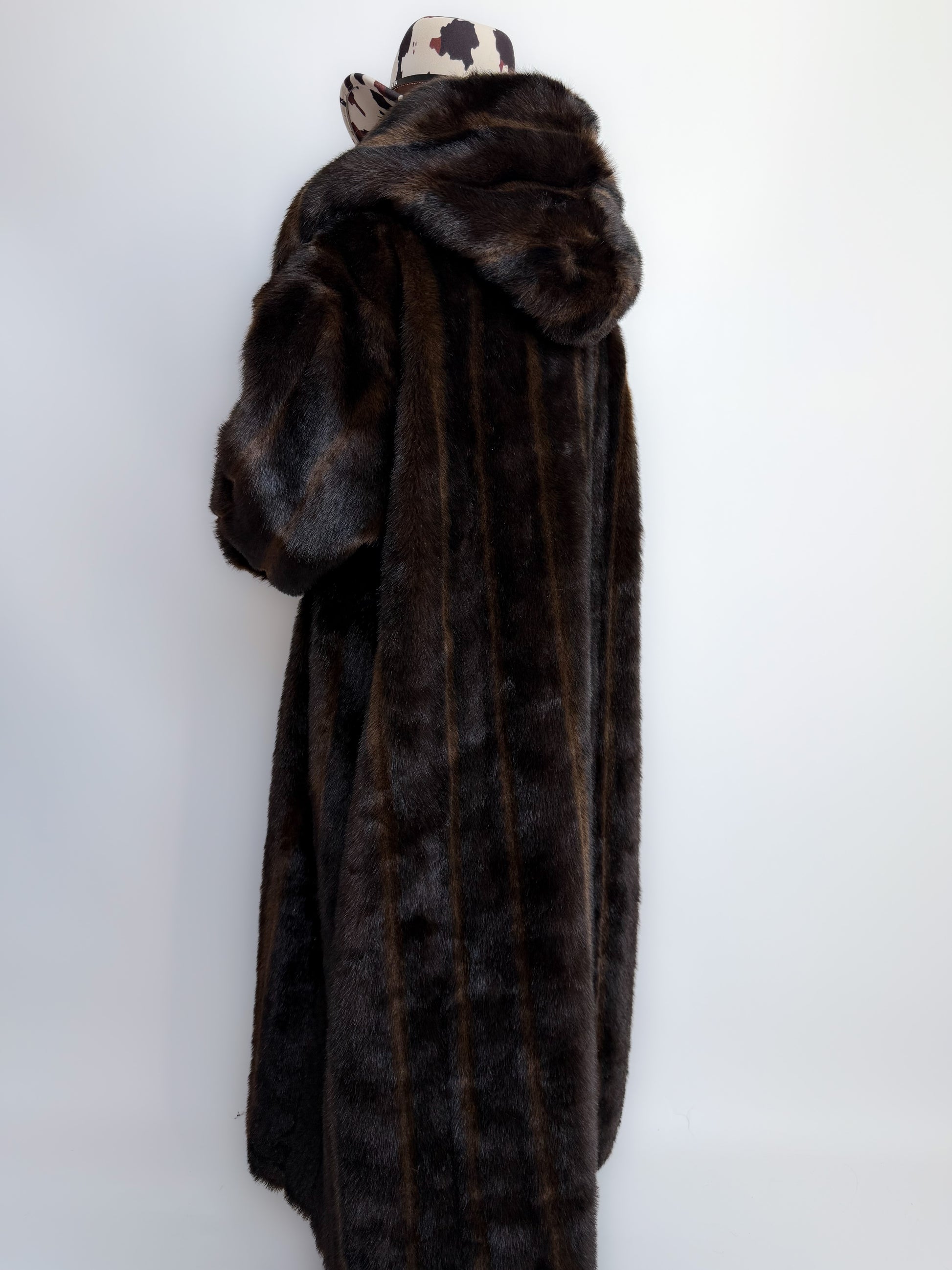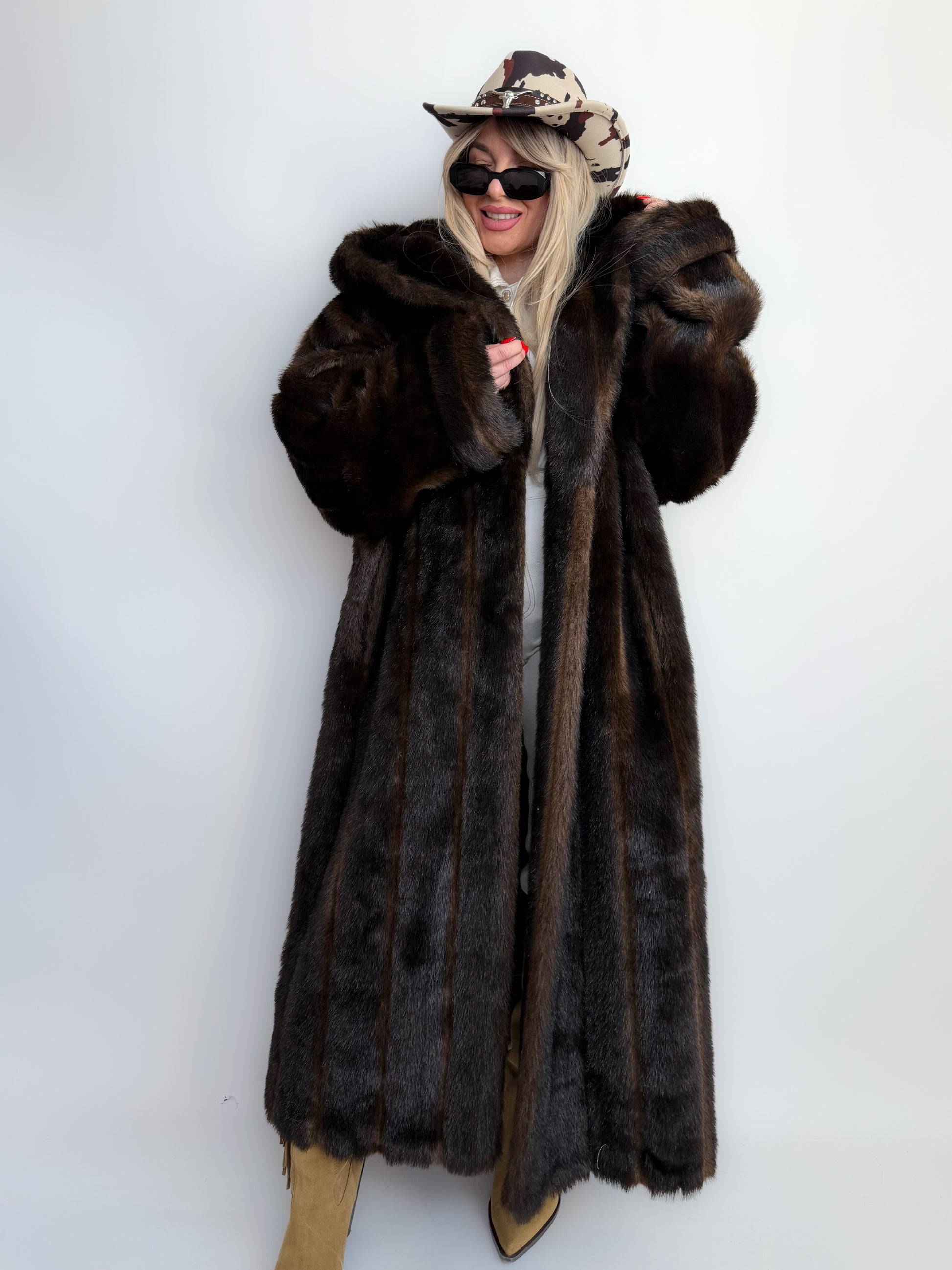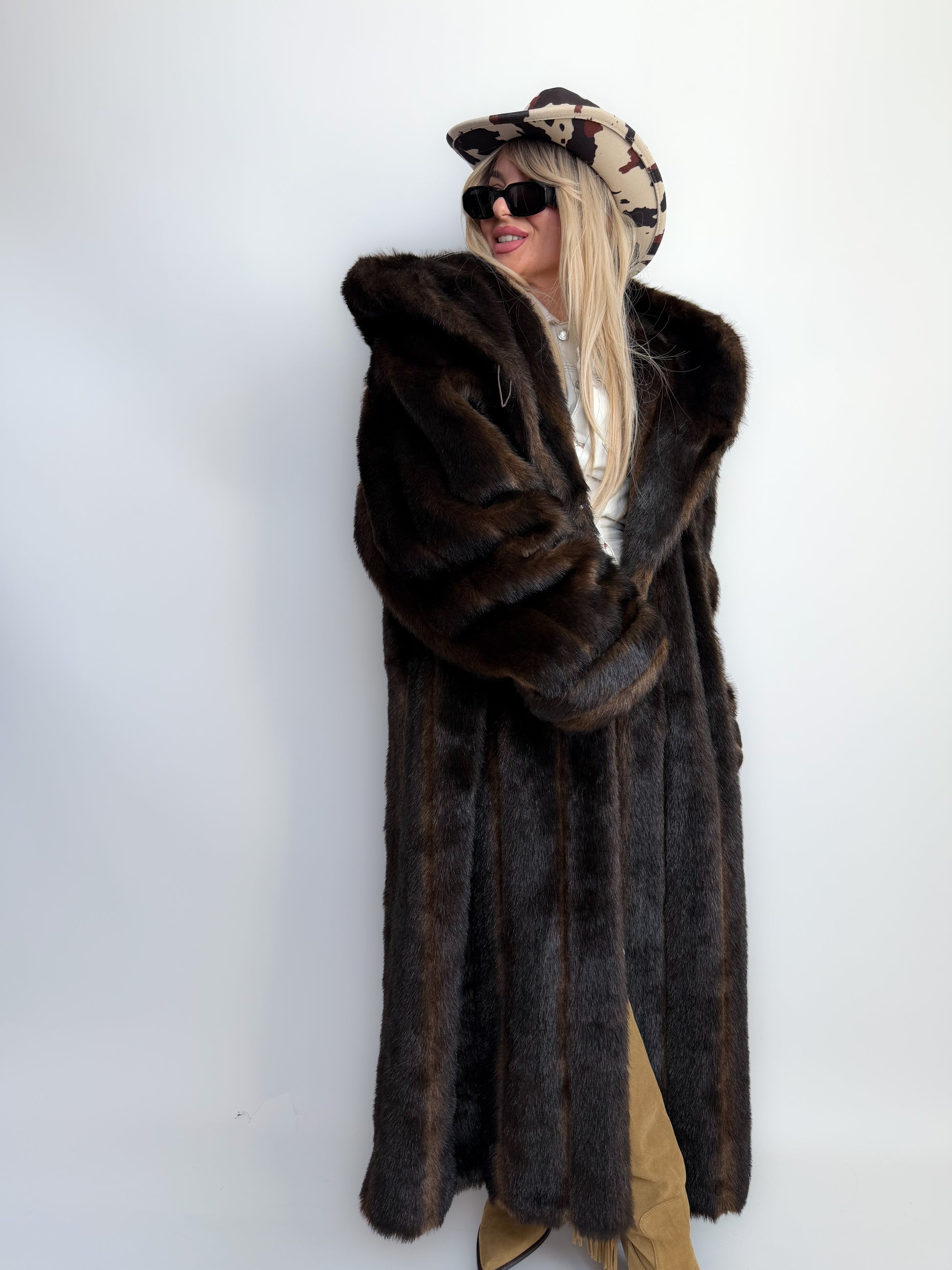 This vintage faux fur coat is pure winter luxury. Designed in a deep, rich brown tone with a dramatic full-length silhouette, it delivers warmth, presence, and timeless glam. The oversized fit, plush texture, and hooded design make it both striking and wearable. A rare, one-of-a-kind statement piece made for cold days when you want maximum impact.