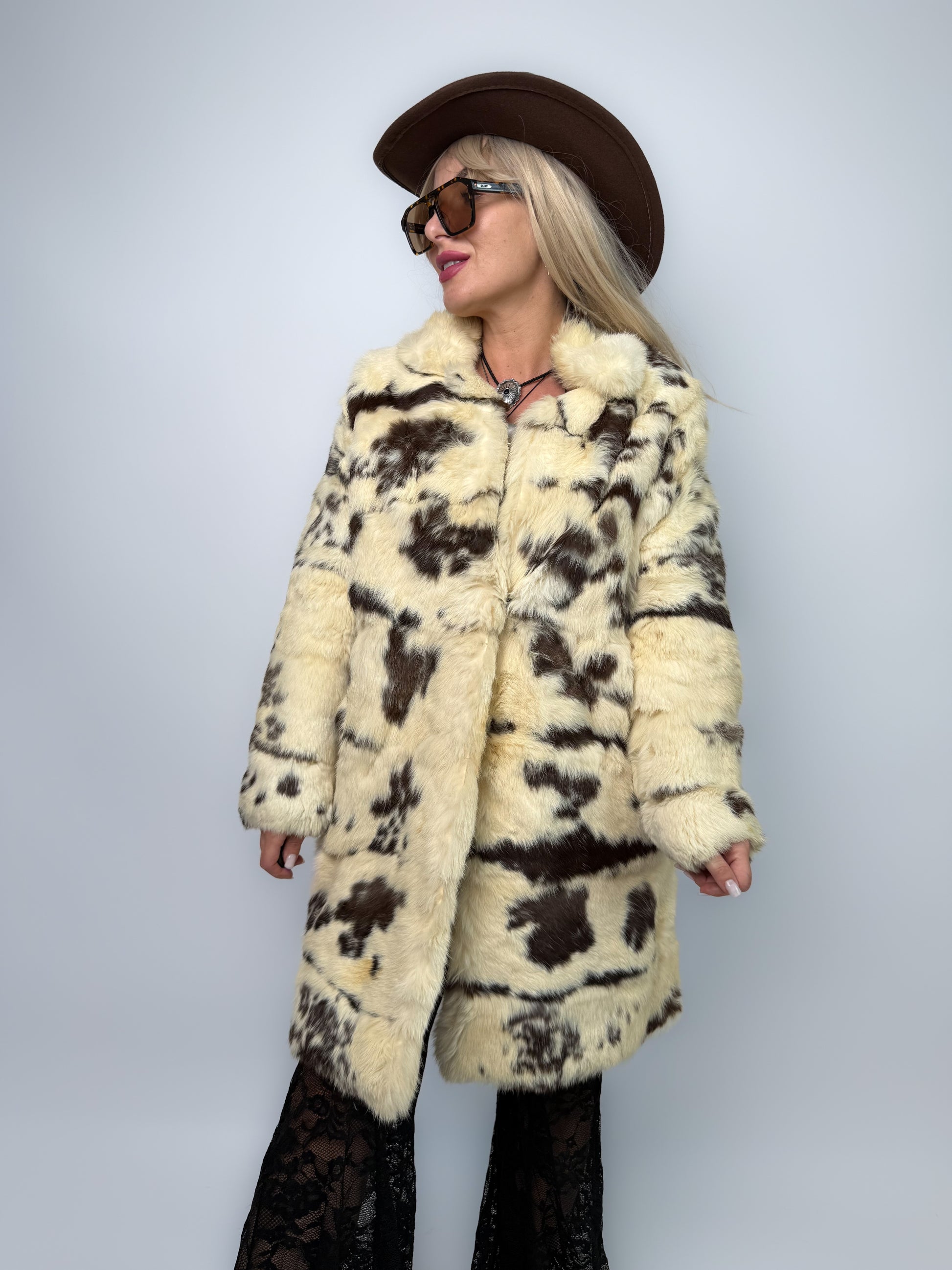 Vintage Natural Rabbit Fur Cow Print Coat with Collar & Pockets S
