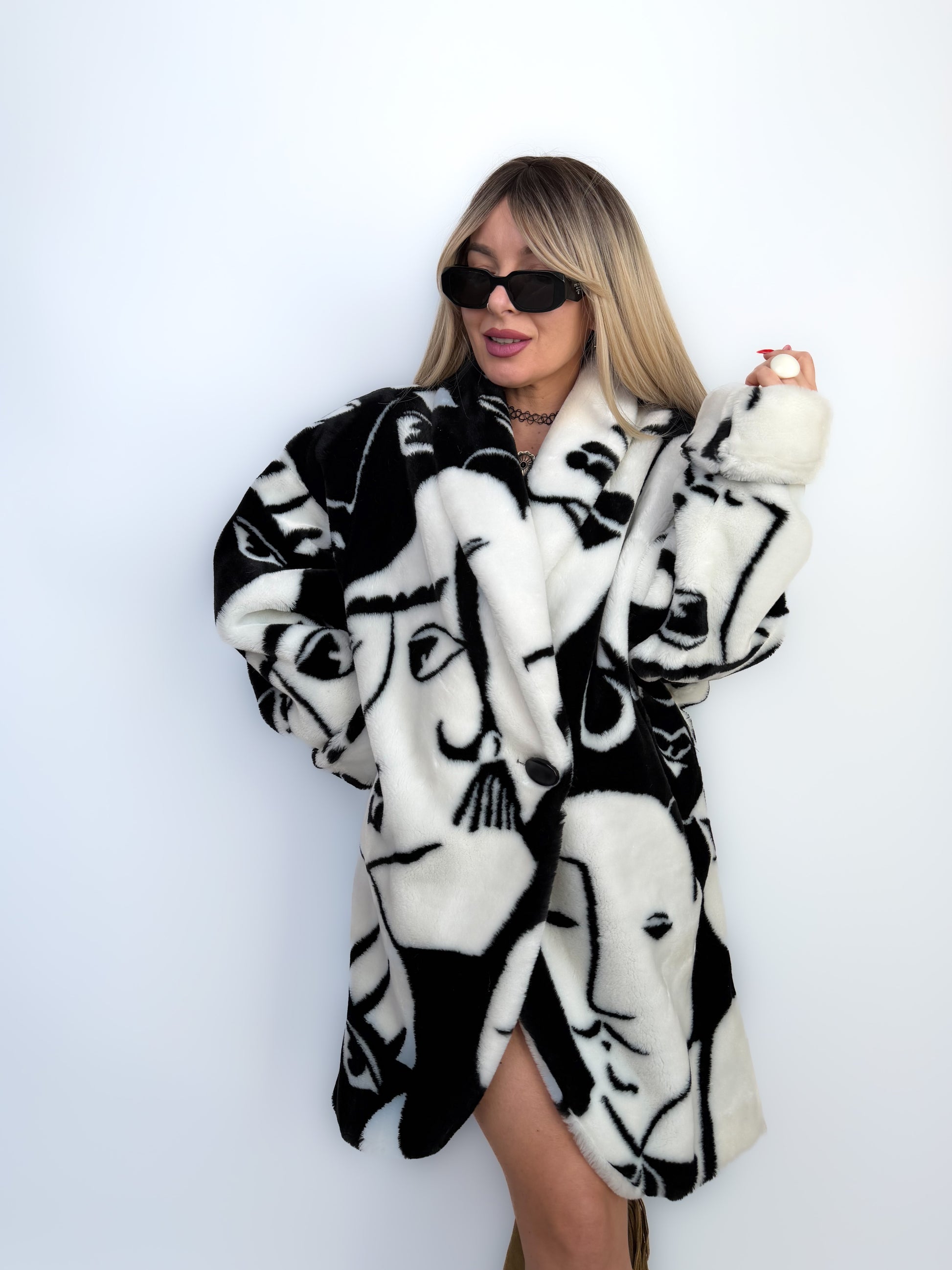 Iconic Celebrity Loved Vintage Faux Fur Coat Abstract Art Faces S-L