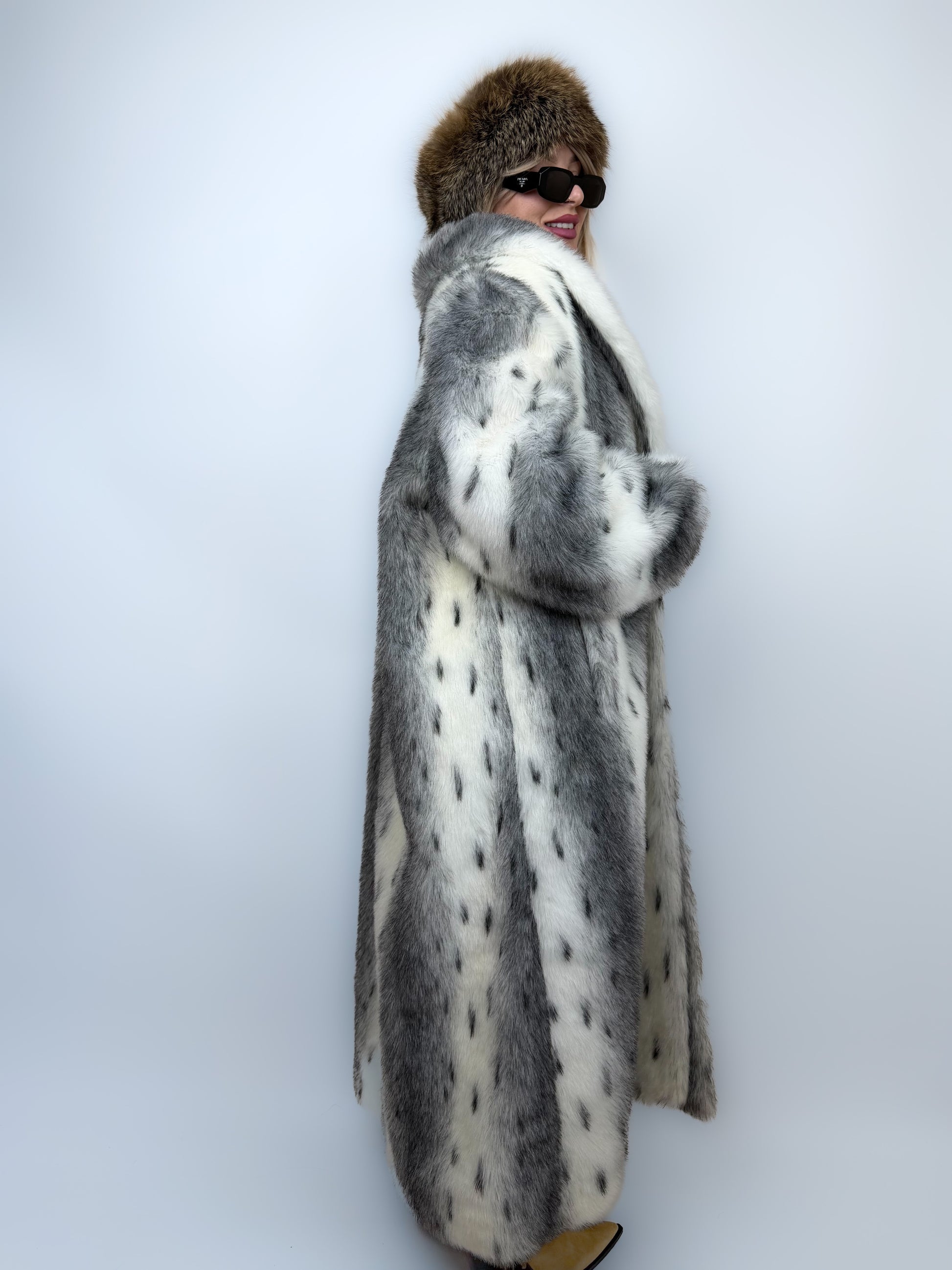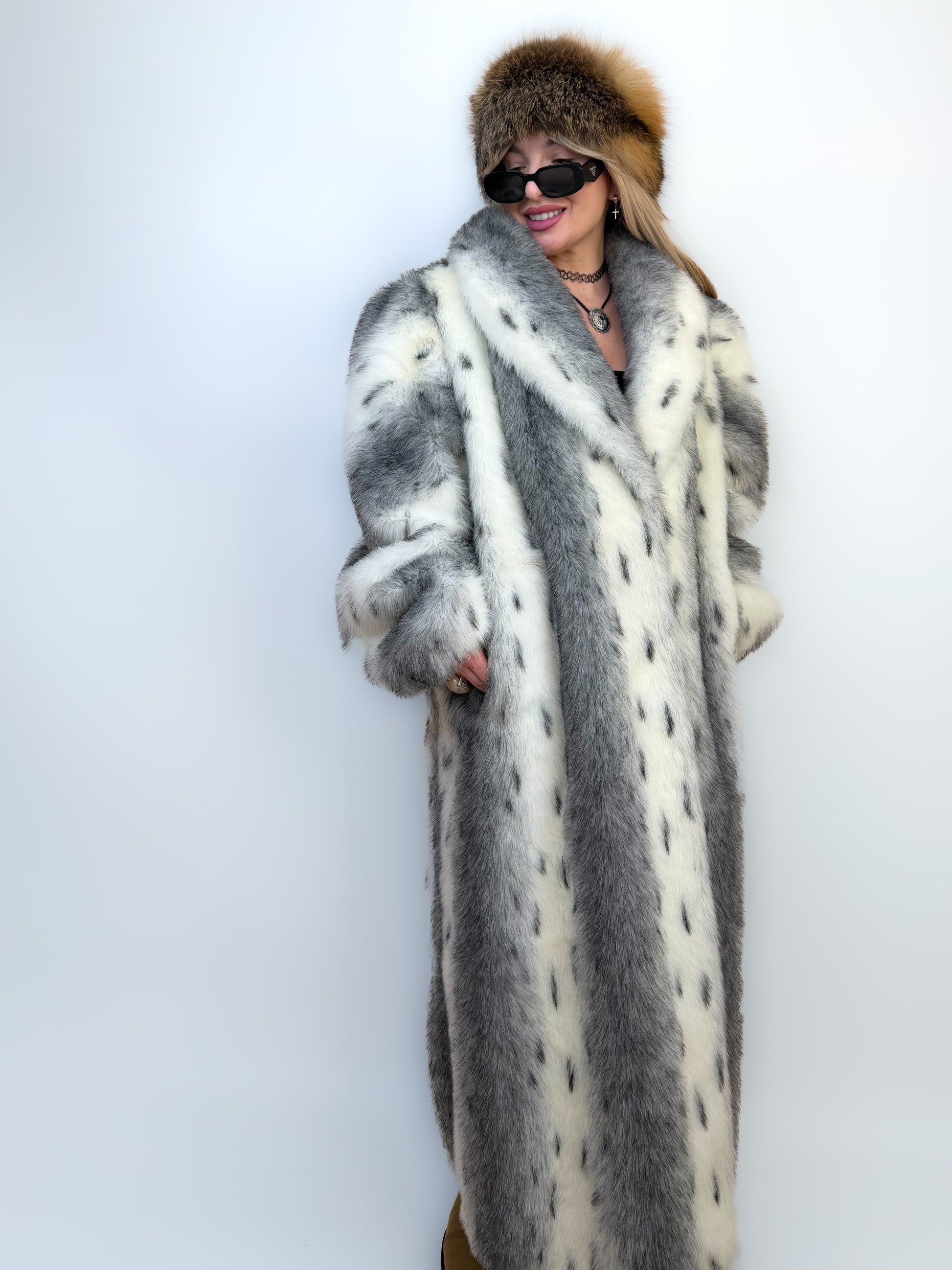 An unforgettable vintage statement coat inspired by snow fox and lynx patterns, crafted in plush faux fur with dramatic gray and white tones. This full-length winter coat is exceptionally heavy, warm, and luxurious, designed to turn heads while delivering real cold-weather performance.
