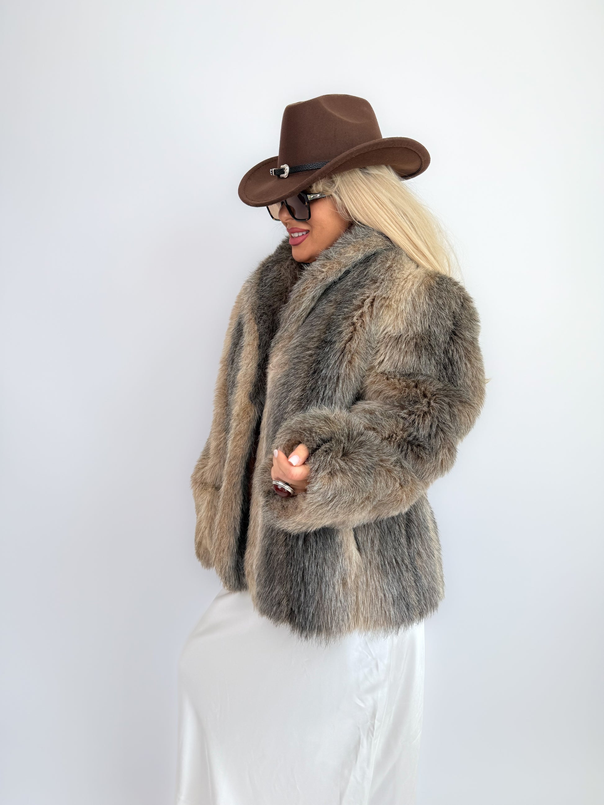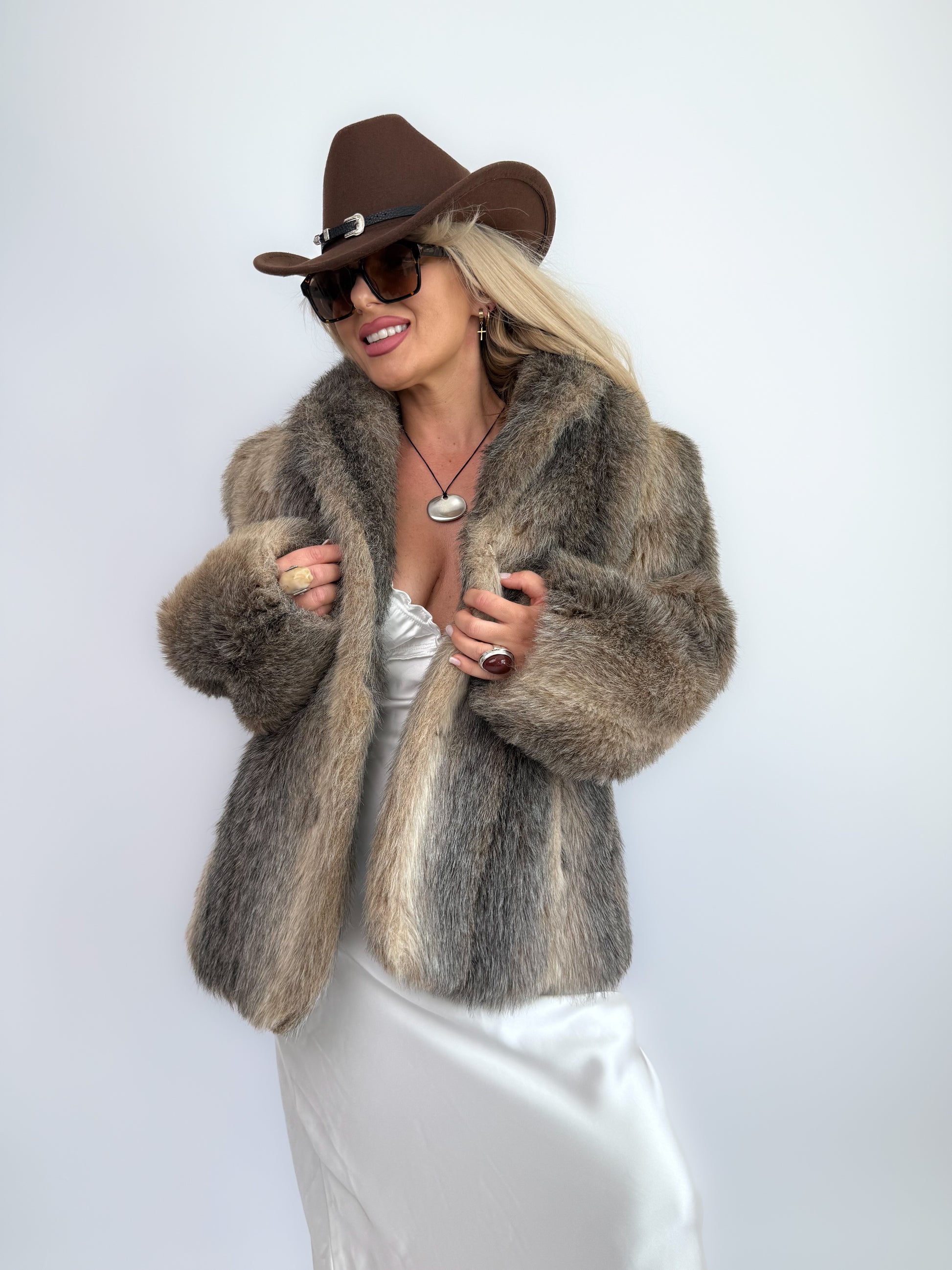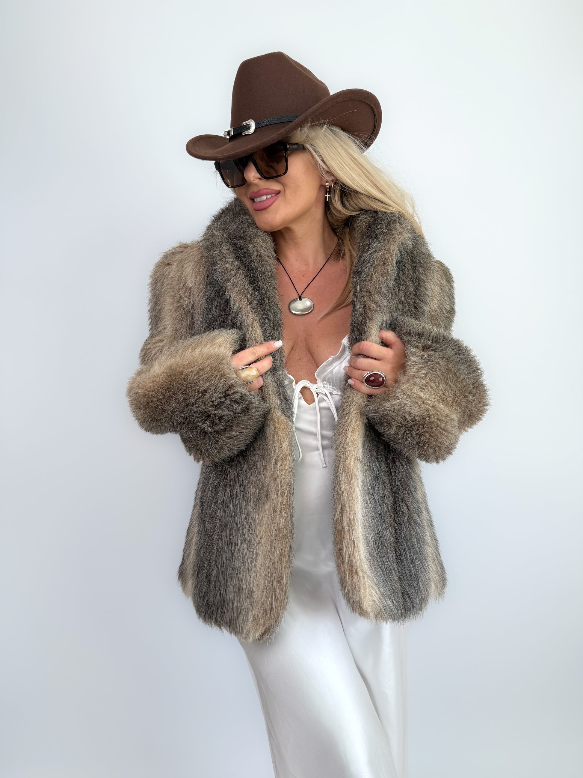 This vintage faux fur coat brings full-on glam with plush taupe and brown tones, a bold v-neckline, and a dramatic silhouette. The mix of rich, natural hues gives it an almost lynx-like edge, perfect for channeling your inner diva. Shoulder pads and a soft sheen lining bring that classic 90s energy, while the hook-and-eye closure keeps it chic and effortless. A power coat made for power moves.
