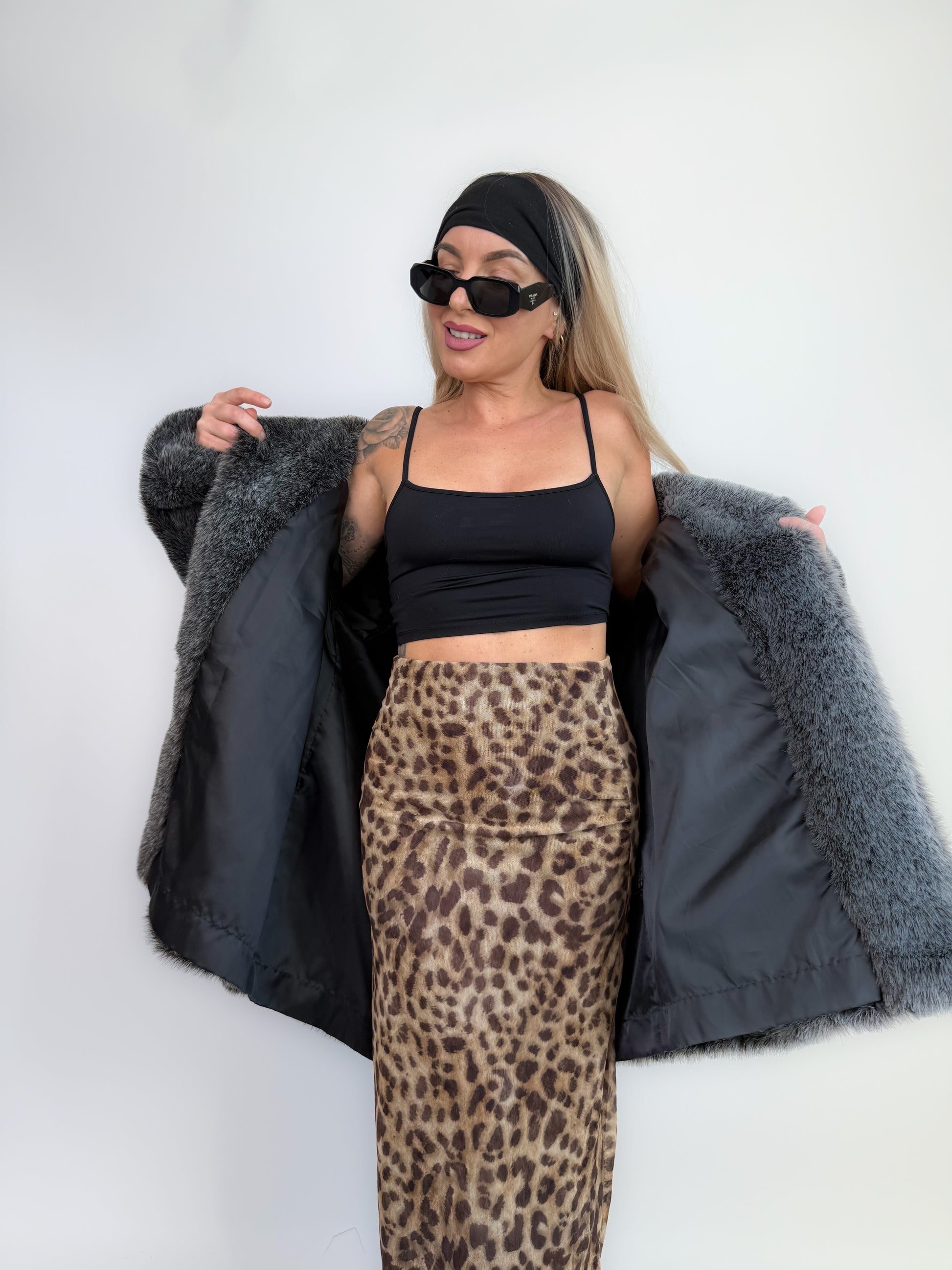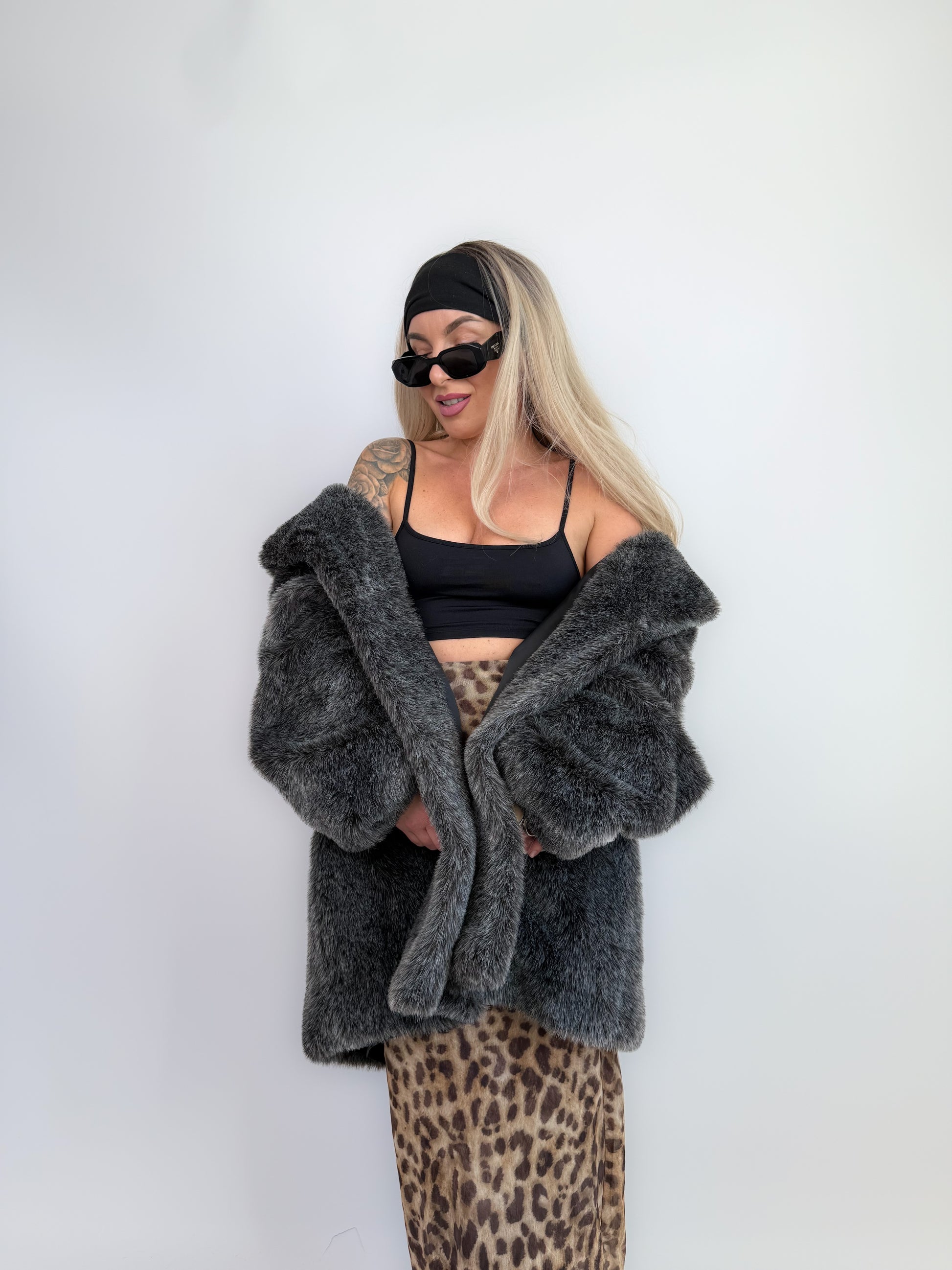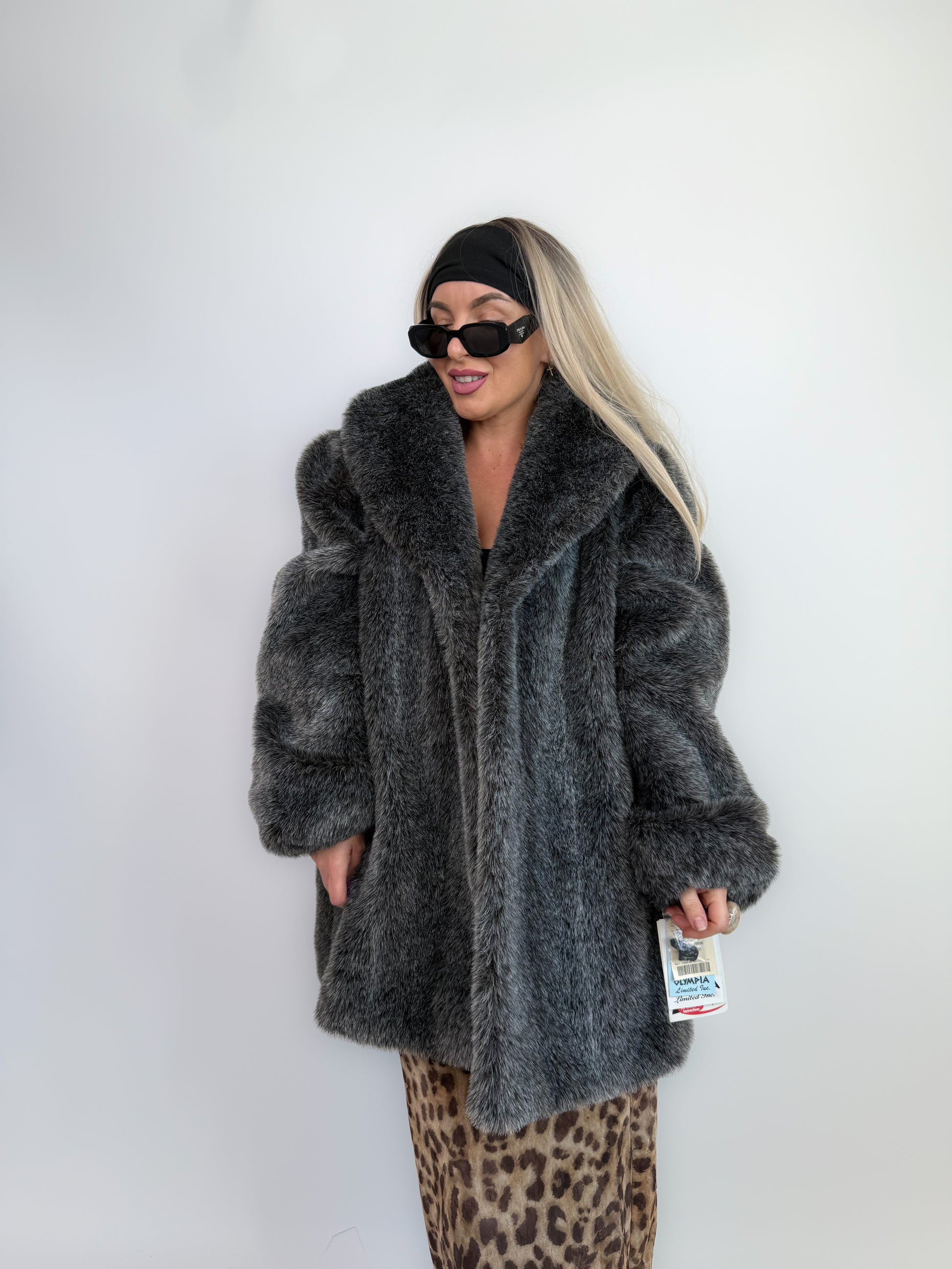 Turn winter into your runway with this stunning frosted gray faux fur coat. Plush, soft, and dramatically oversized, it channels pure 80s glam with its voluminous raccoon-effect texture and sculpted shoulders. New with tags — a rare vintage find that makes a statement without saying a word.