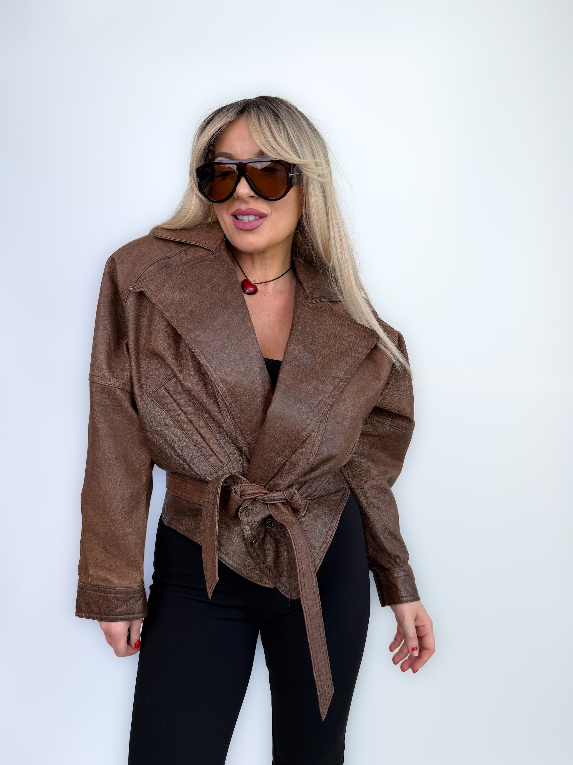 Bold, badass, and beautifully broken in — this Y2K-era leather bomber is the moment. Crafted from genuine brown leather with a grunge-chic matte finish, this cropped jacket channels streetwise cool with an edge. Its slightly exaggerated collar, built-in shoulder pads, and waist tie give it a power-silhouette that flatters and commands attention. Whether you’re layering it over denim or rocking it open over bare legs like a total heartbreaker, this jacket does all the talking.
